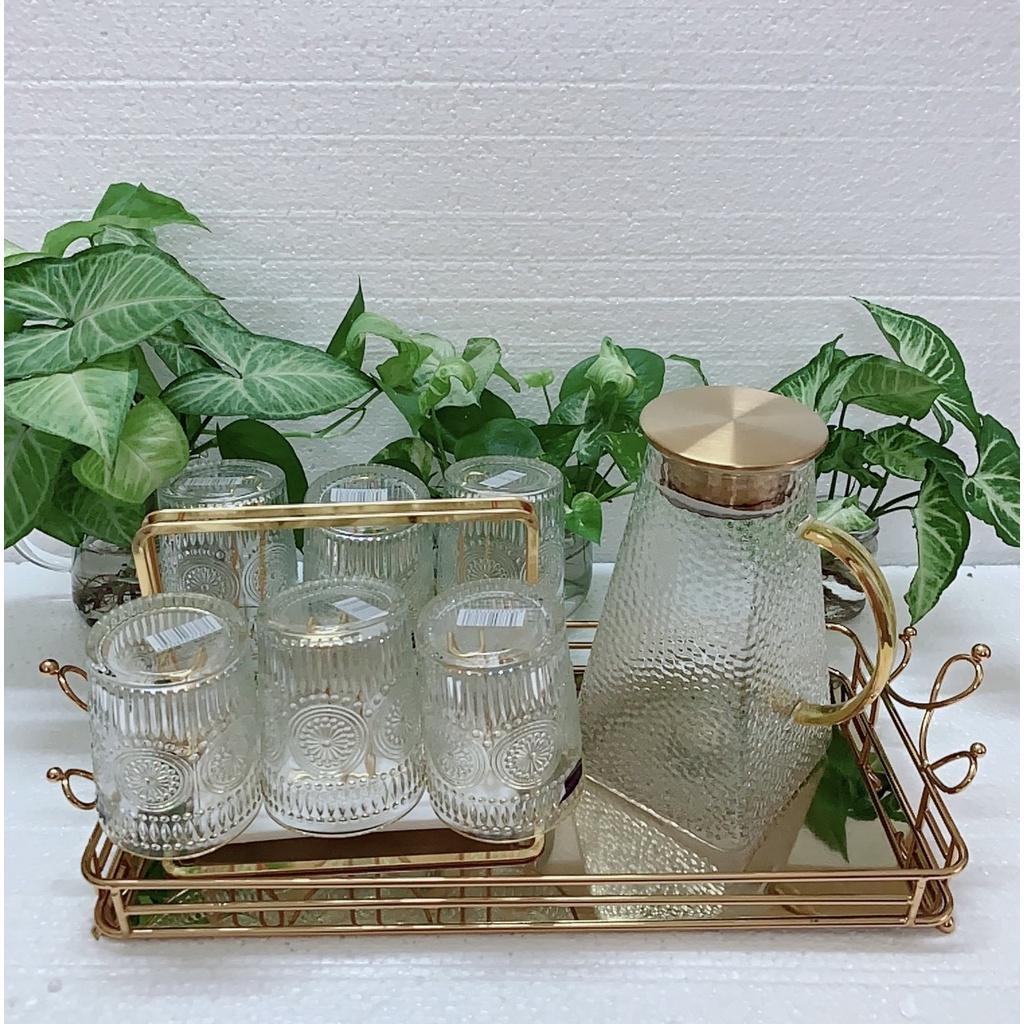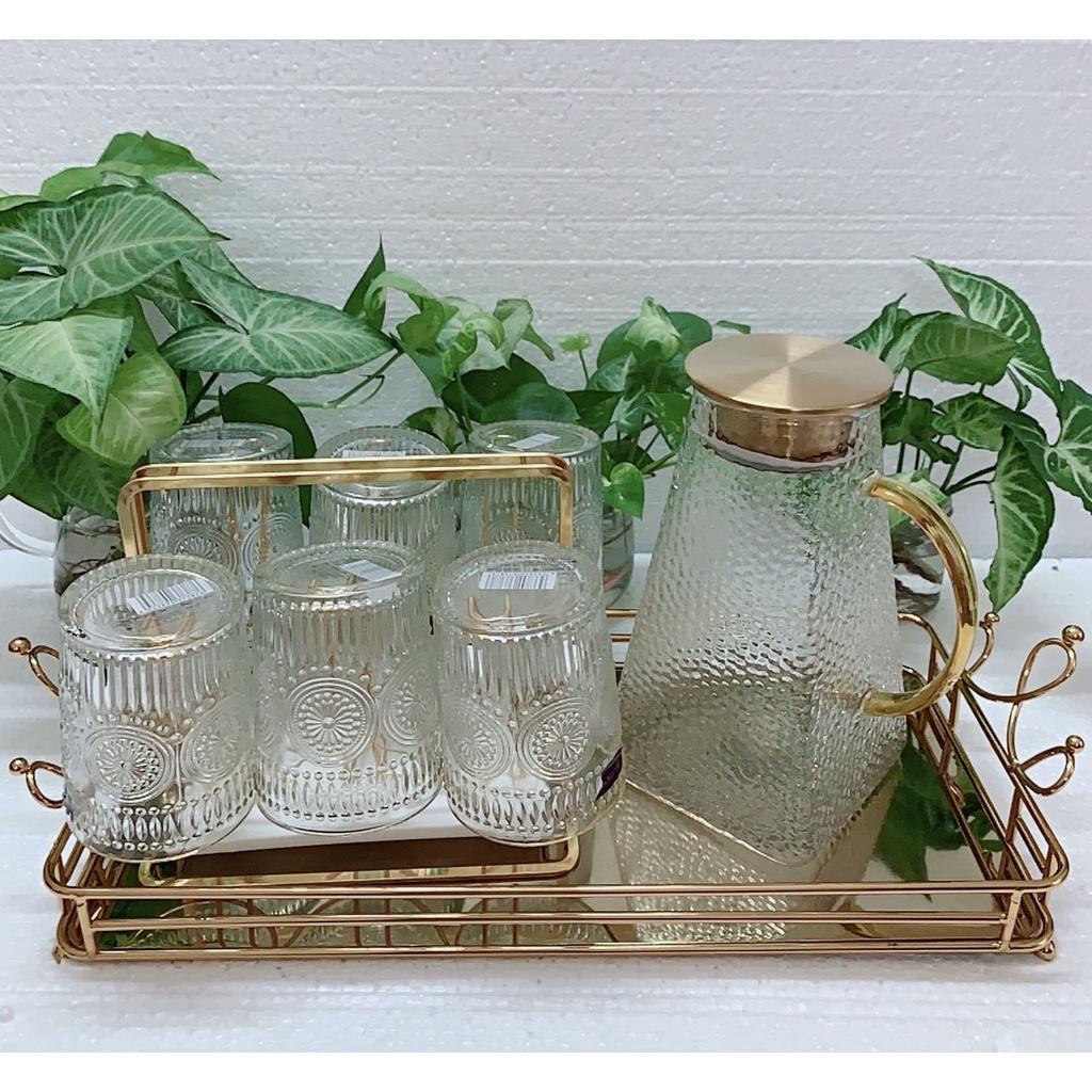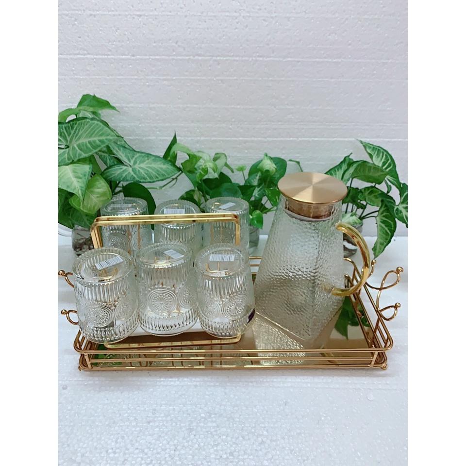 - Bộ combo Gồm 1 bình thủy tinh & 6 cốc thủy tinh HOA MẶT TRỜI 300ML + 1 khay inox tráng gương mạ vàng hình vương miện + 1 gía úp cốc kim loại mạ vàng. 2 - Bộ combo Gồm 1 bình thủy tinh & 6 cốc thủy tinh + 1 khay inox tráng gương mạ vàng hình vương miện. 3 - Bình đựng nước uống thủy tinh đáy vuông 1800ml. 4 – Khay khay inox tráng gương mạ vàng hình vương miện: 50x20,5x5cm 6 - Giá úp cốc Chất liệu kim loại. 8 – Bộ 6 cốc 360ML