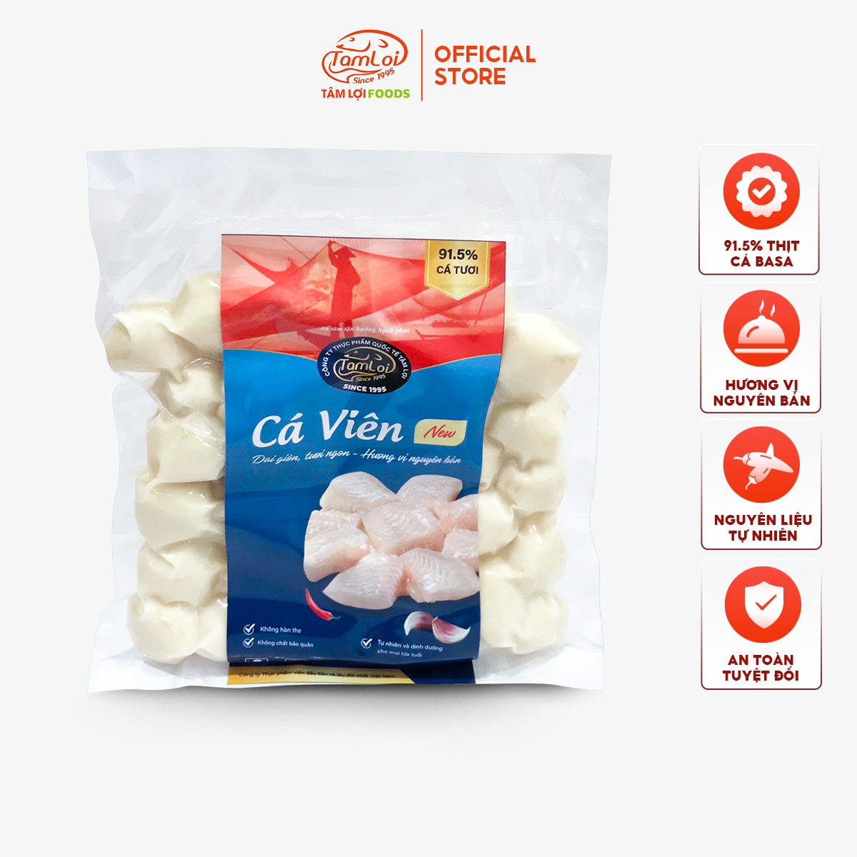 • Cá viên Tâm Lợi được sản xuất từ 91.5% thịt cá basa tươi, đây là con số rất cao trong ngành thực phẩm viên, một tỉ lệ mà ít nhà sản xuất có thể thực hiện bởi chi phí cao và lợi nhuận thấp. Cam kết không sử dụng các chất phụ gia gây hại cho sức khoẻ người tiêu dùng.