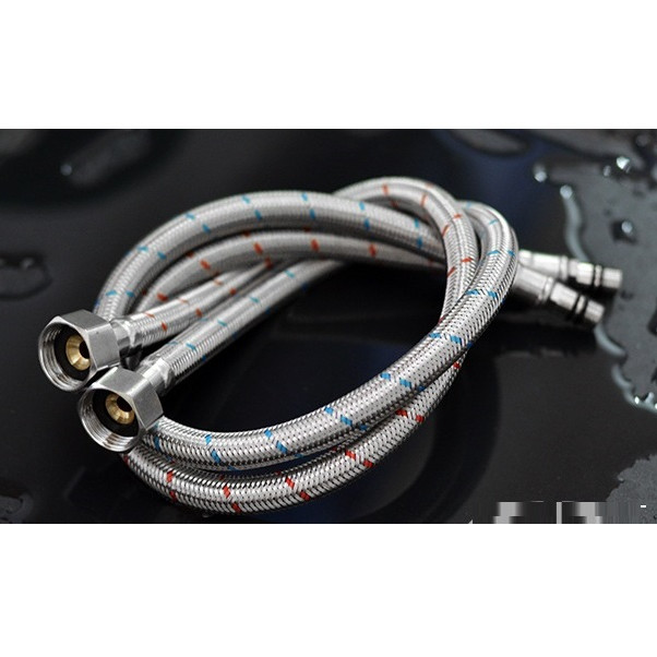 Bộ sản phẩm kèm theo 2 dây cấp nước với lõi bằng nhựa PVC chịu nhiệt (-20 đến 100 độ C) chịu áp lực nước lên đến 35kg/cm2, vỏ ngoài bằng inox 304 siêu bền, không hoen gỉ, không xoắn, các đầu ốc có gioăng đệm tuyệt đối không bị rò nước.