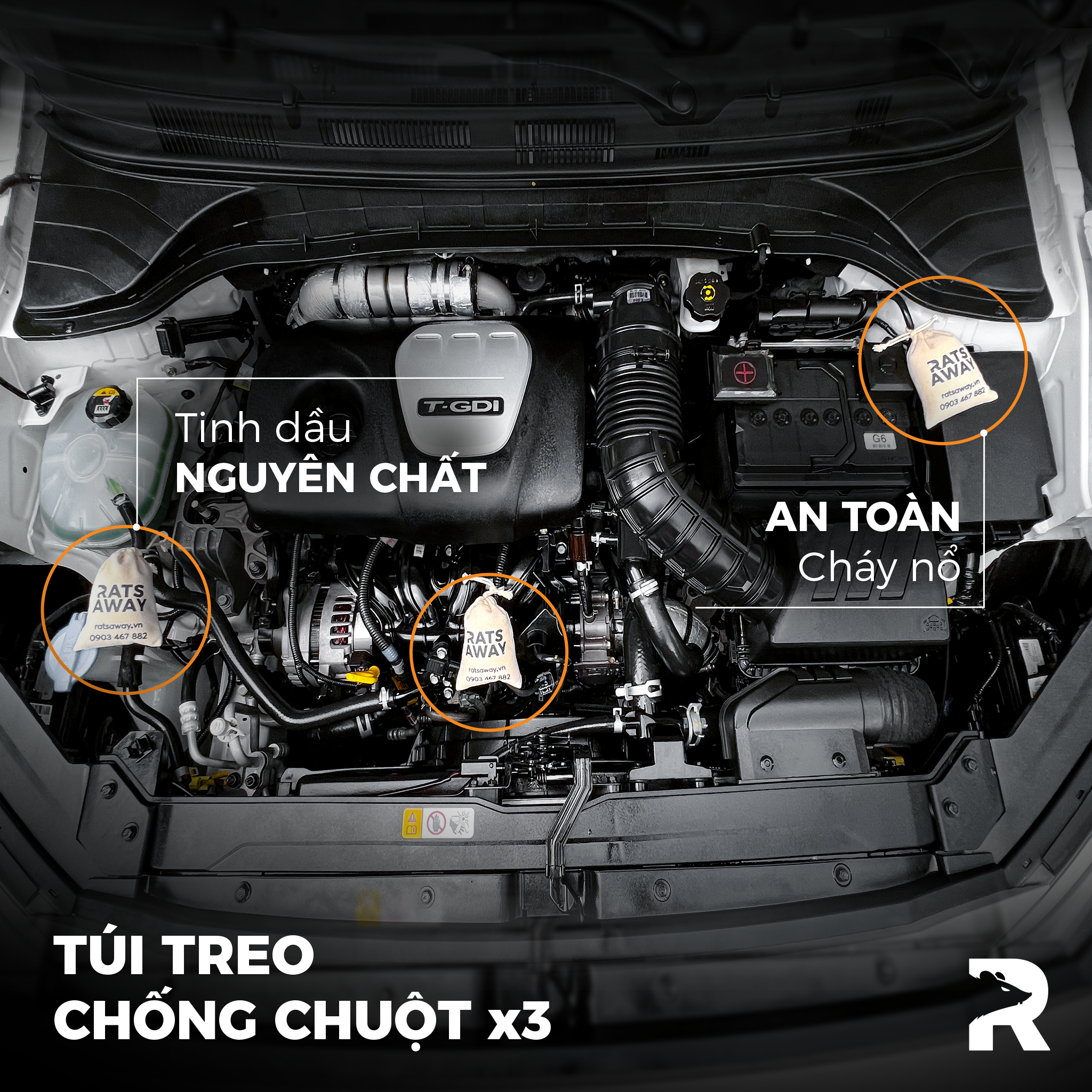 COMBO BAO GỒM + 2-3 Túi treo chống chuột RATS AWAY. Trọng lượng: 50g/túi + 1 Chai xịt đuổi chuột RATS AWAY. Dung tích: 500ml (~1000 lần xịt) Khuyên dùng: Với xe gầm thấp: ít