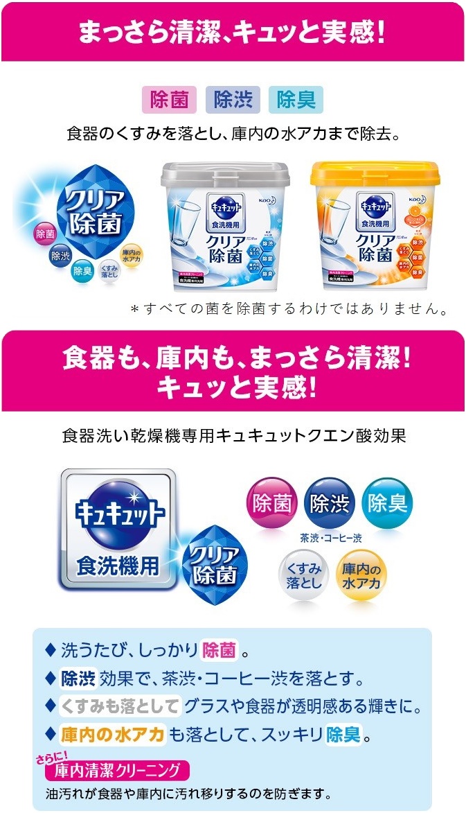 - Không mùi ● Thành phần: Surfactant, glycosides alkyl, chất ổn định, chất khử trùng, chất hoạt động bề mặt 3%, chất làm mềm nước ● Công dụng: Nhờ "Hiệu ứng axit citric" sử dụng cơ chế tập trung làm sạch của enzyme kép và axit citric ở nồng độ cao, giúp phân hủy mạnh các chất bẩn cứng đầu, vết cặn canxi và khử mùi vệ sinh trong khoang máy. Đối với máy Nhật Bản khi sử dụng không cần bổ sung thêm muối làm mềm nước và dung dịch trợ xả như các loại bột rửa chén bát có xuất xứ từ châu Âu. Bột rửa chén bát Kao Kyukyuto giúp làm mềm nước trong máy rửa chén. Nước máy thông thường có chứa nhiều canxi, magie sẽ gây lên sự tích tụ cặn vôi trong máy rửa chén, đồng thời làm giảm tính năng làm sạch của bột rửa chén bát, gây tắc vòi phun nước, ống dẫn và đặc biệt tạo ra các mảng bám trên bề mặt thành trong của khoang máy và chén đĩa hay đồ sành sứ, thủy tinh, inox và các dụng cụ nhà bếp của bạn. 2.ƯU ĐIỂM SẢN PHẨM