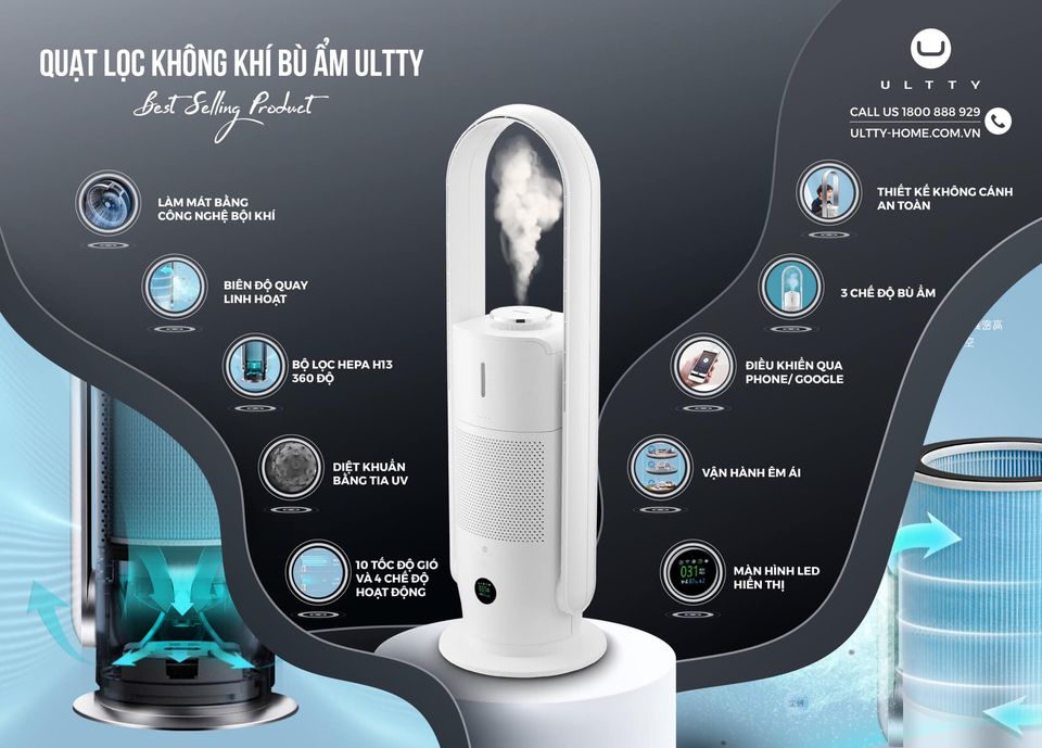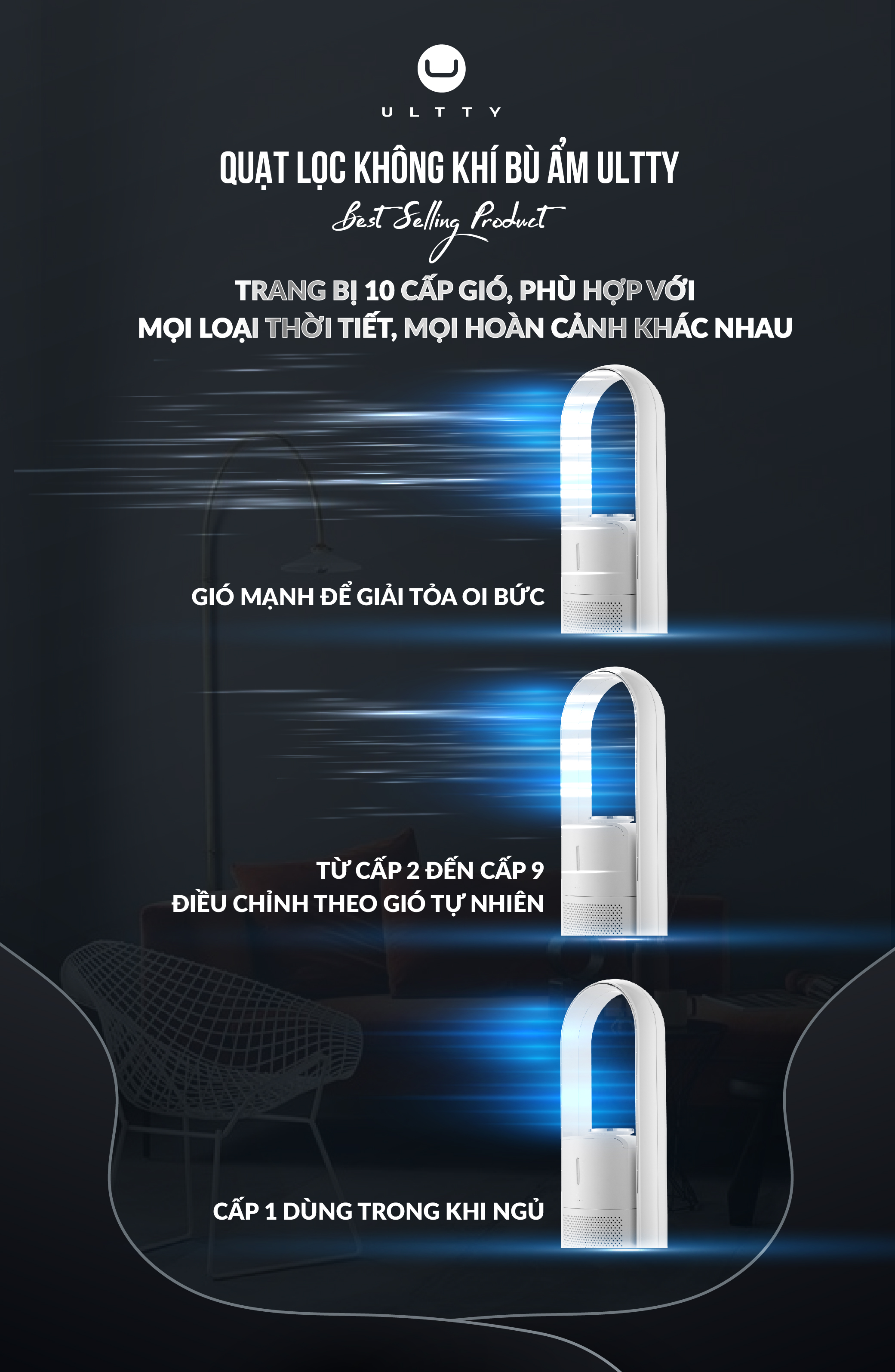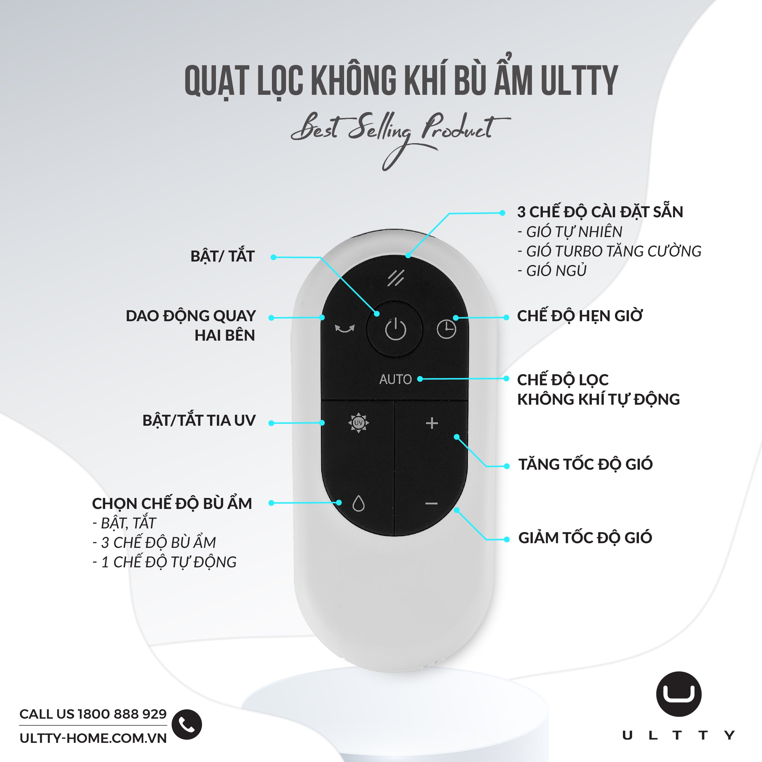 - Bình chứa nước lên tới 1200ml cùng chế độ bù ẩm 3 cấp độ và chế độ tự động, quạt Ultty sẽ tạo ra độ ẩm lý tưởng cho căn phòng, giúp gia đình bạn đánh bay khô nóng khó chịu. Khử khuẩn bằng tia UV dạng modun cao cấp