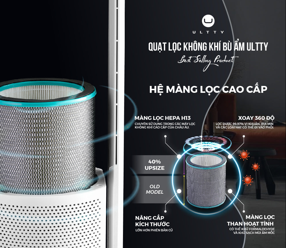 - Đặc biệt, ở phiên bản mới này, màng lọc được nâng cấp kích thước lớn hơn đến 40%, tăng khả năng lọc lên gấp nhiều lần. Màng lọc HEPA H14 loại bỏ các hạt bụi lơ lửng trong không khí, virus corona không thể bám vào tạo thành khí dung để lan truyền và khuếch tán lây nhiễm Hệ màng lọc hình trụ 360 độ hiệu quả vượt trội Đa số màng lọc của các máy lọc không khí trên thị trường là hệ phẳng, chỉ lọc được một hướng duy nhất, còn hệ màng lọc của Ultty SKJ-CR022 có cấu tạo hình trụ, giúp khả năng lọc 360 độ, lưu trữ bụi hiệu quả vượt trội. Lớp kim loại tĩnh điện cao cấp Hệ màng lọc của Ultty SKJ-CR022 được bao bọc bên ngoài bởi lớp kim loại tĩnh điện, không chỉ giúp dễ vệ sinh hơn các sản phẩm khác trên thị trường mà còn làm tăng tuổi thọ cho màng lọc Sản phẩm “4 trong 1” – Tích hợp thêm khả năng quạt mát, bù ẩm, diệt khuẩn tia UV Sở hữu 3 công nghệ làm mát hiện đại bậc nhất hiện nay