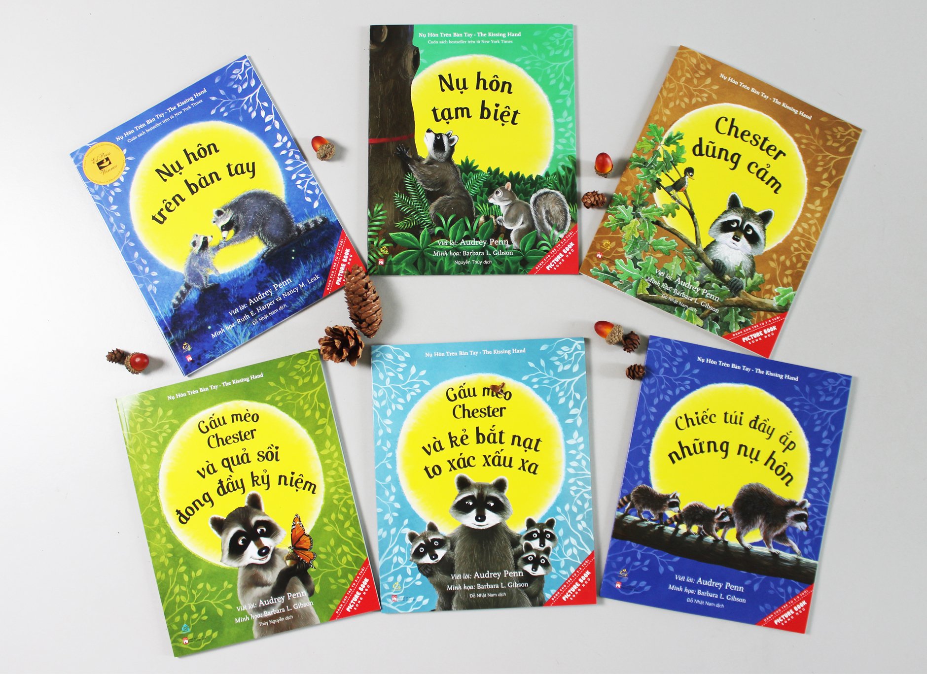 “Nụ hôn trên bàn tay" là bộ sách thiếu nhi kinh điển được hàng triệu độc giả nhỏ trên toàn thế giới yêu thích, đây cũng là bộ sách tranh bán chạy nhất do tạp chí New York Times bình chọn. Từng câu chuyện nhỏ về tình yêu thương được kể một cách giản dị và quá đỗi ngọt ngào qua cuộc sống hàng ngày của gia đình bạn gấu mèo Chester. Bộ sách gồm 6 cuốn được Ehomebooks phát hành dưới dạng sách tranh song ngữ hai đầu (một đầu là tiếng Việt, một đầu là tiếng Anh) và được chuyển ngữ bởi dịch giả Đỗ Nhật Nam: