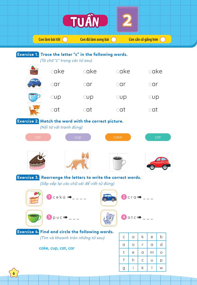 - Hệ thống các bài tập phong phú, mang tính tổng hợp và ôn luyện toàn diện. Hệ thống bài tập đa dạng, lượng phù hợp với việc học cuối tuần để các con vẫn có thời gian thư giãn và vui chơi. Đặc biệt, sau mỗi kì sẽ có bài ôn tập giữa kì và cuối kì giúp con có tài liệu ôn tập cho các kì kiểm tra.