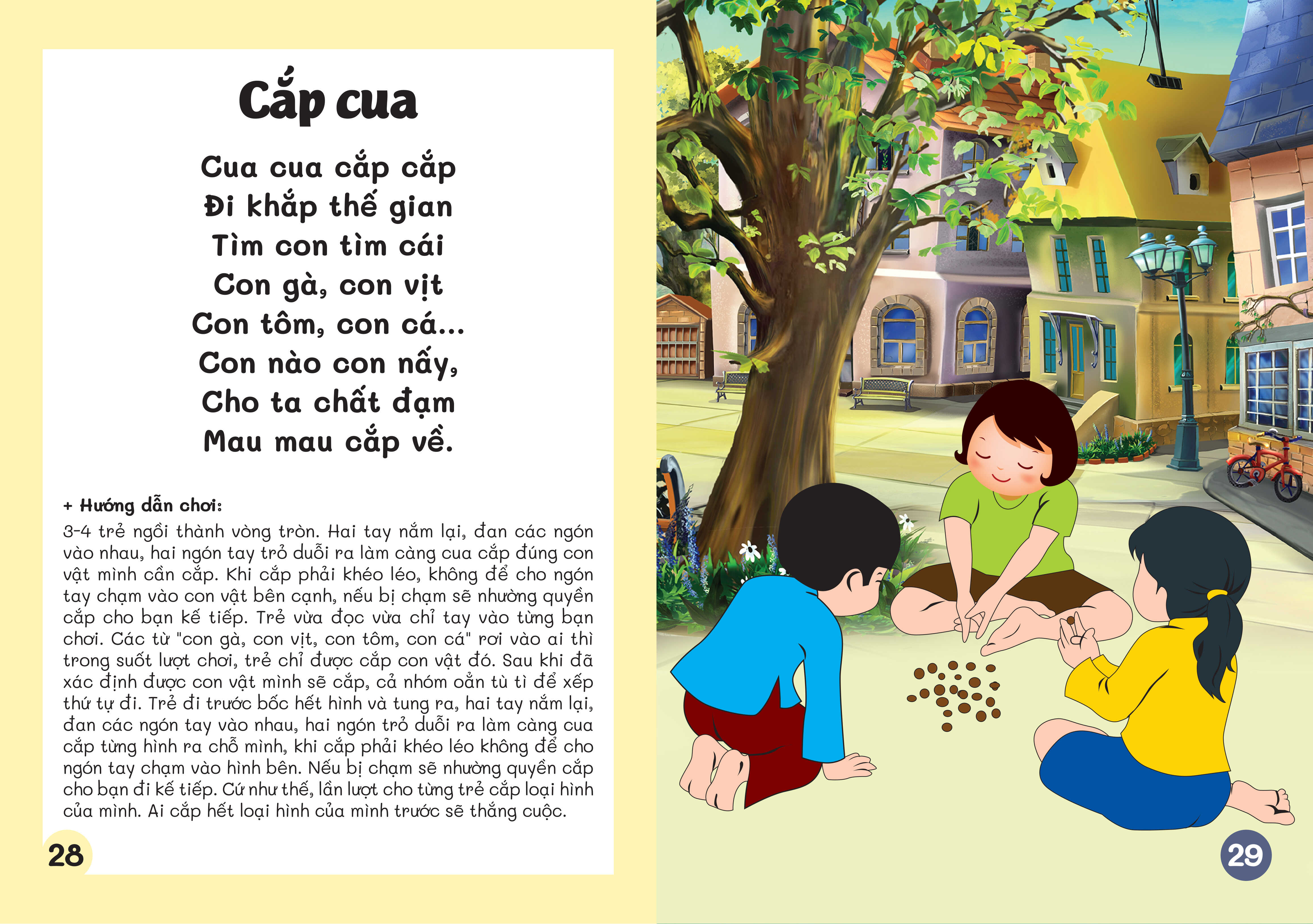 Quyển 2: Đồng dao cho bé - Các trò chơi dân gian - Các câu hát vè dân gian - Bé từ 3 đến trở lên (dành cho bé tập nói) Trong sách gồm 2 Phần: Phần 1: 32 trò chơi dân gian Phần 2: 24 bài hát vè dân gian