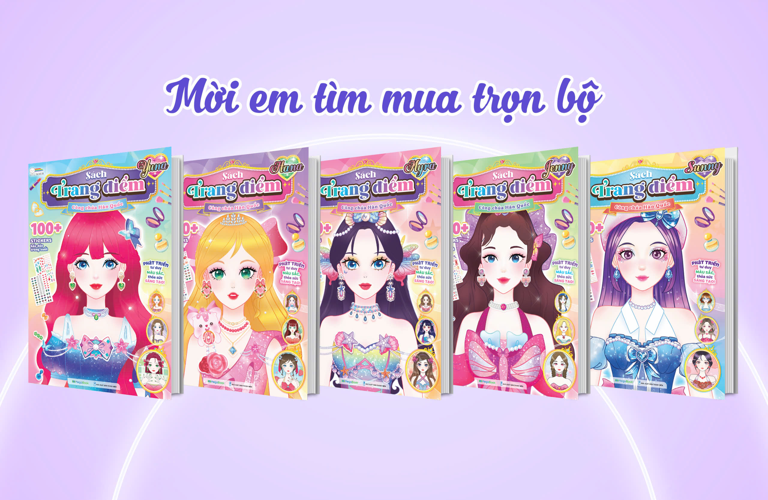 Bộ sách công chúa trang điểm trọn bộ gồm 5 cuốn, mỗi cuốn có 24 hình công chúa Hàn Quốc giúp các bé thỏa sức sáng tạo, hóa thân thành các phù thủy make up. Các bé có thể trang điểm cho các nàng công chúa với phong cách khác nhau: vẽ lông mày, đeo lens, tô son, đeo khuyên tai, dây chuyền.. làm tất cả mọi thứ để các nàng công chúa xinh hơn.