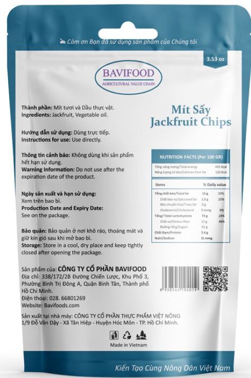 Mua tại TiktokMÔ TẢ SẢN PHẨM Tên sản phẩm: Trái cây sấy chân không - BAVI. Thương hiệu: BAVIFOOD Dòng sản phẩm: Cao cấp - Premium. Phương pháp sấy: Sấy chân không. Thành phần: Mít chín, Chuối chín, Khoai lang vàng, Khoai lang tím, Khoai môn và Dầu thực vật. Đặc tính: Sản phẩm giòn xốp mà vẫn giữ được hương vị thơm ngon, vị ngọt thanh tự nhiên …, màu sắc tươi nguyên và bảo toàn được giá trị dinh dưỡng. Đóng gói: