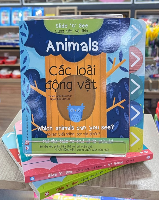 Bộ sách ""Slide and see"" cho bé tương tác trực tiếp kéo phần tấm thẻ ra để khám phá bí mật đằng sau mỗi trang sách. Mỗi cuốn sách được sáng tạo dựa trên một chủ đề và bao gồm các từ vựng Tiếng Anh cho bé vừa chơi vừa học: