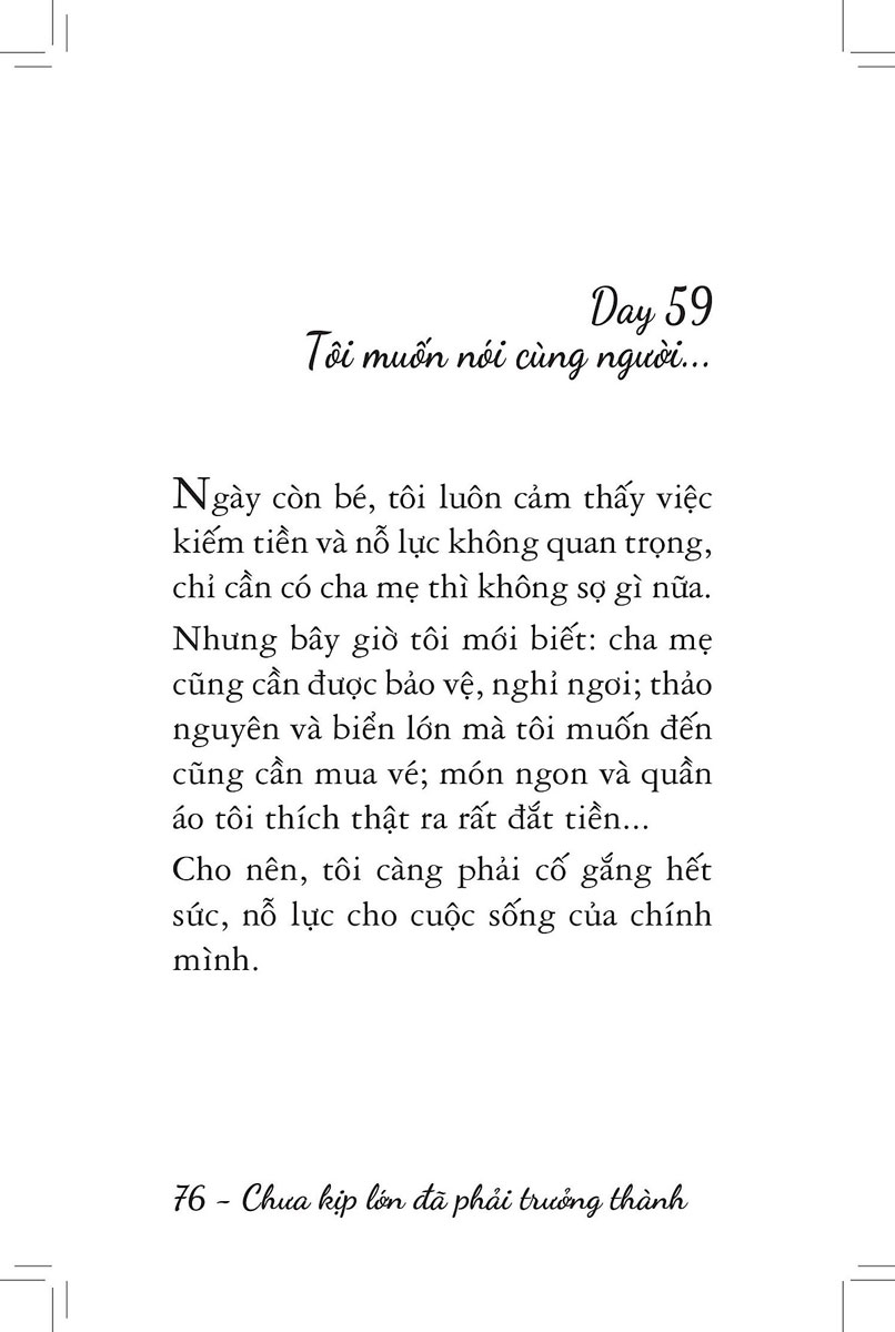 Nếu bạn đang trải qua giai đoạn lạc lõng và cô đơn như vậy, hãy để Chưa Kịp Lớn Đã Phải Trưởng Thành làm một người bạn ở bên, xoa dịu tổn thương và gửi tặng bạn đôi điều khích lệ. Mỗi trang sách đều là một lá thư nhắn nhủ bạn về sự đặc biệt của bản thân, về những nỗ lực hoàn thiện không ngừng nghỉ trong thế giới của người trưởng thành.
