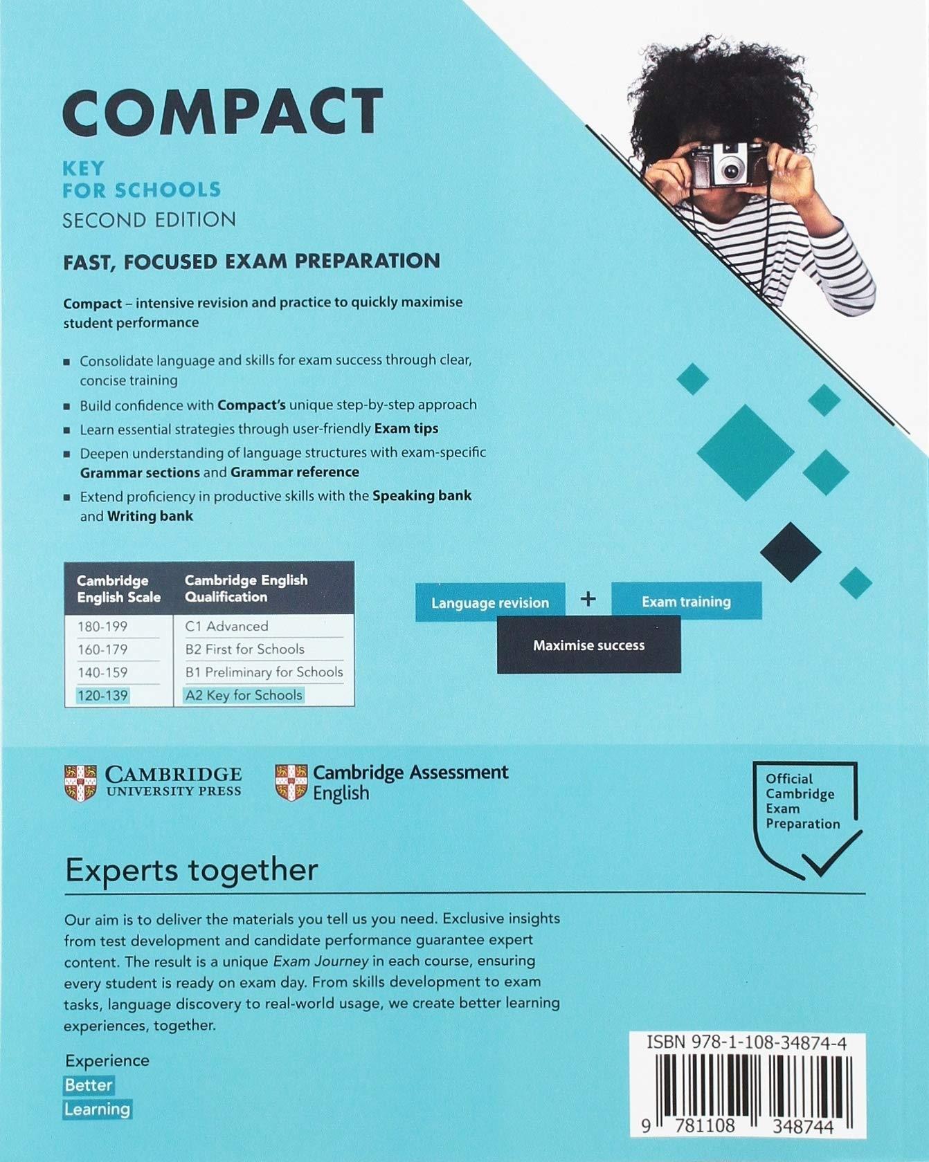 Fast, focused exam preparation - a 50 to 60 hour course for the A2 Key for Schools exam from 2020. Compact Key for Schools Student's Book offers intensive revision and practice to quickly maximise performance. You will consolidate language and skills for exam success through clear, concise training. Compact help you build confidence with its unique step-by-step approach and teaches essential exam strategies through user-friendly Exam tips. The exam-specific Grammar sections and Grammar reference deepen understanding of language structures, while the Speaking bank and Writing bank extend proficiency in productive skills. Online Practice accompanying each Student's Book offers additional practice in grammar and vocabulary. Downloadable Class Audio for listening activities is provided with the Teacher's Book.