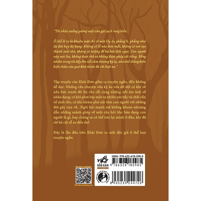 Tập truyện của Khải Đơn gồm 14 truyện ngắn, đều không dễ đọc. Những câu chuyện vừa kỳ ảo, vừa dữ dội có khi vẽ nên bức tranh đô thị cằn cỗi cùng những nỗi ám ảnh về nhân dạng, có khi phơi bày một tự nhiên nát bấy và chất vấn về sinh tồn; có khi khám phá nội tâm con người với những đứt gãy vụn vỡ… Ngòi bút mạnh mẽ không khoan nhượng dẫn những mảnh ghép về một câu hỏi lớn: bản dạng con người là gì, hay chúng ta có thể tìm lại mình ở đâu, khi đã rời bỏ cội rễ xa đến thế.