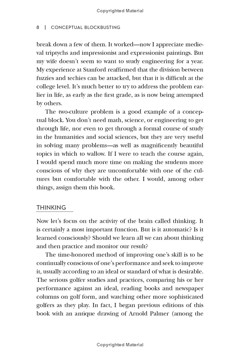 More than three decades after its original publication, Conceptual Blockbusting has never been more relevant, powerful, or fresh. Integrating insights from the worlds of psychology, engineering, management, art, and philosophy, Adams identifies the key blocks (perceptual, emotional, cultural, environmental, intellectual, and expressive) that prevent us from realizing the full potential of our fertile minds. Employing unconventional exercises and other interactive elements, Adams shows individuals, teams, and organizations how to overcome these blocks, embrace alternative ways of thinking about complex problems, and celebrate the joy of creativity. Completely revised and updated with the latest cognitive science and addressing new subjects such as changes in technology, creativity in large groups, and sustaining creativity over time, Conceptual Blockbusting will introduce a new generation of readers to a world of new possibilities.