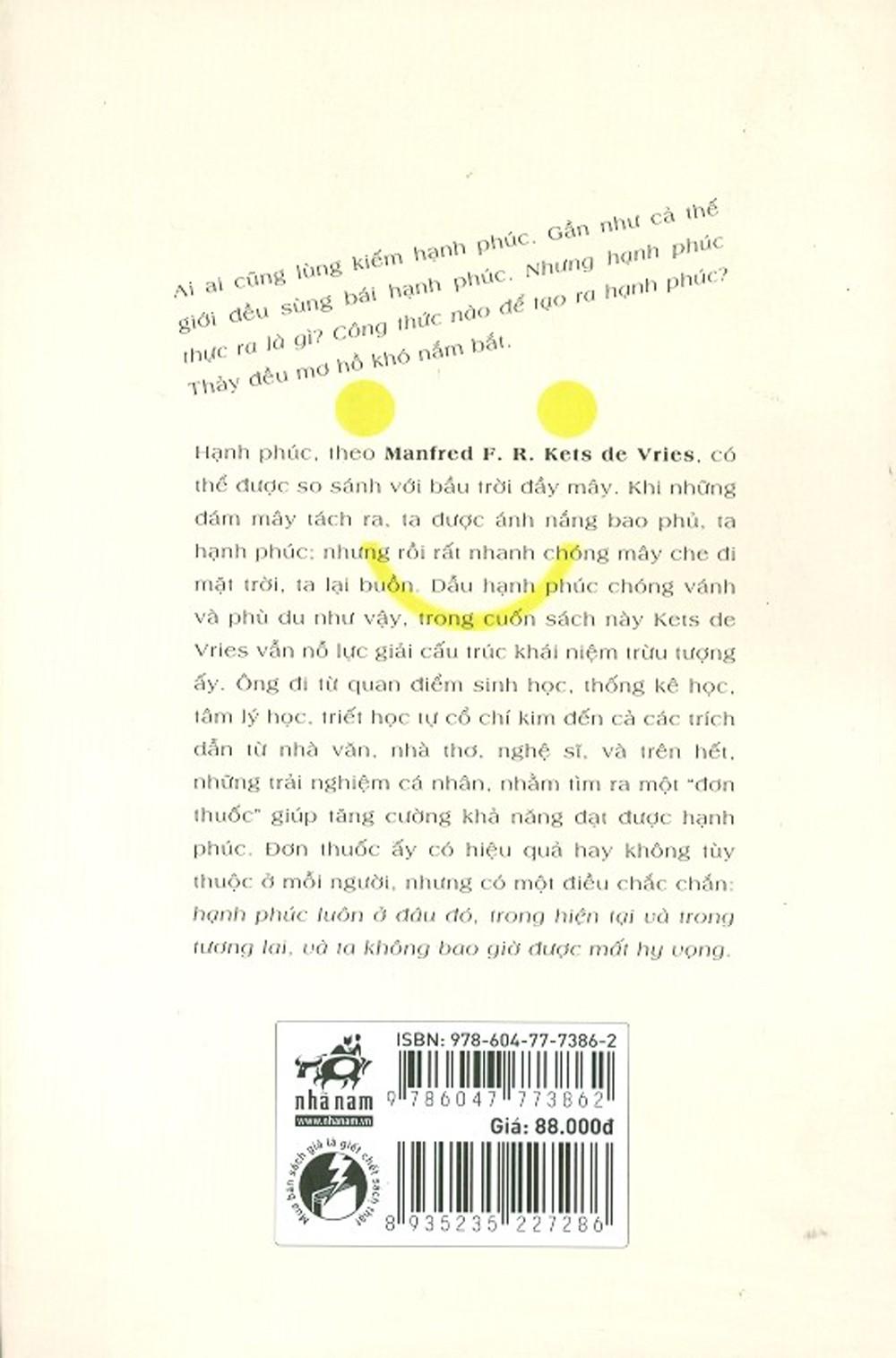Trong cuốn sách này, Kets de Vries nỗ lực giải cấu trúc khái niệm trừu tượng ấy. Ông đi từ quan điểm sinh học, thống kê học, tâm lý học, triết học tự cổ chí kim đến cả các trích dẫn từ nhà văn, nhà thơ, nghệ sĩ, và trên hết, những trải nghiệm cá nhân, nhằm tìm ra một "đơn thuốc" giúp tăng cường khả năng đạt được hạnh phúc. Đơn thuốc ấy có hiệu quả hay không tùy thuộc ở mỗi người, nhưng có một điều chắc chắn: hạnh phúc luôn ở đâu đó, trong hiện tại và trong tương lai, và ta không bao giờ được mất hy vọng.