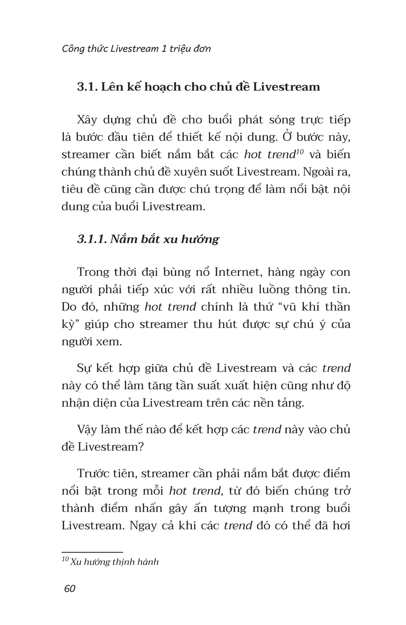 Thông qua nghiên cứu và phân tích dựa trên những buổi livestream thu hút hàng trăm triệu lượt xem của các streamer hàng đầu, “CÔNG THỨC LIVESTREAM 1 TRIỆU ĐƠN” là cuốn sách đúc rút trọn vẹn nhất những kỹ năng và phương pháp livestream, từ đó đưa ra bộ công thức bách chiến bách thằng giúp bạn thành công và đặt dấu ấn rõ nét trên thị trường cạnh tranh khốc liệt này.