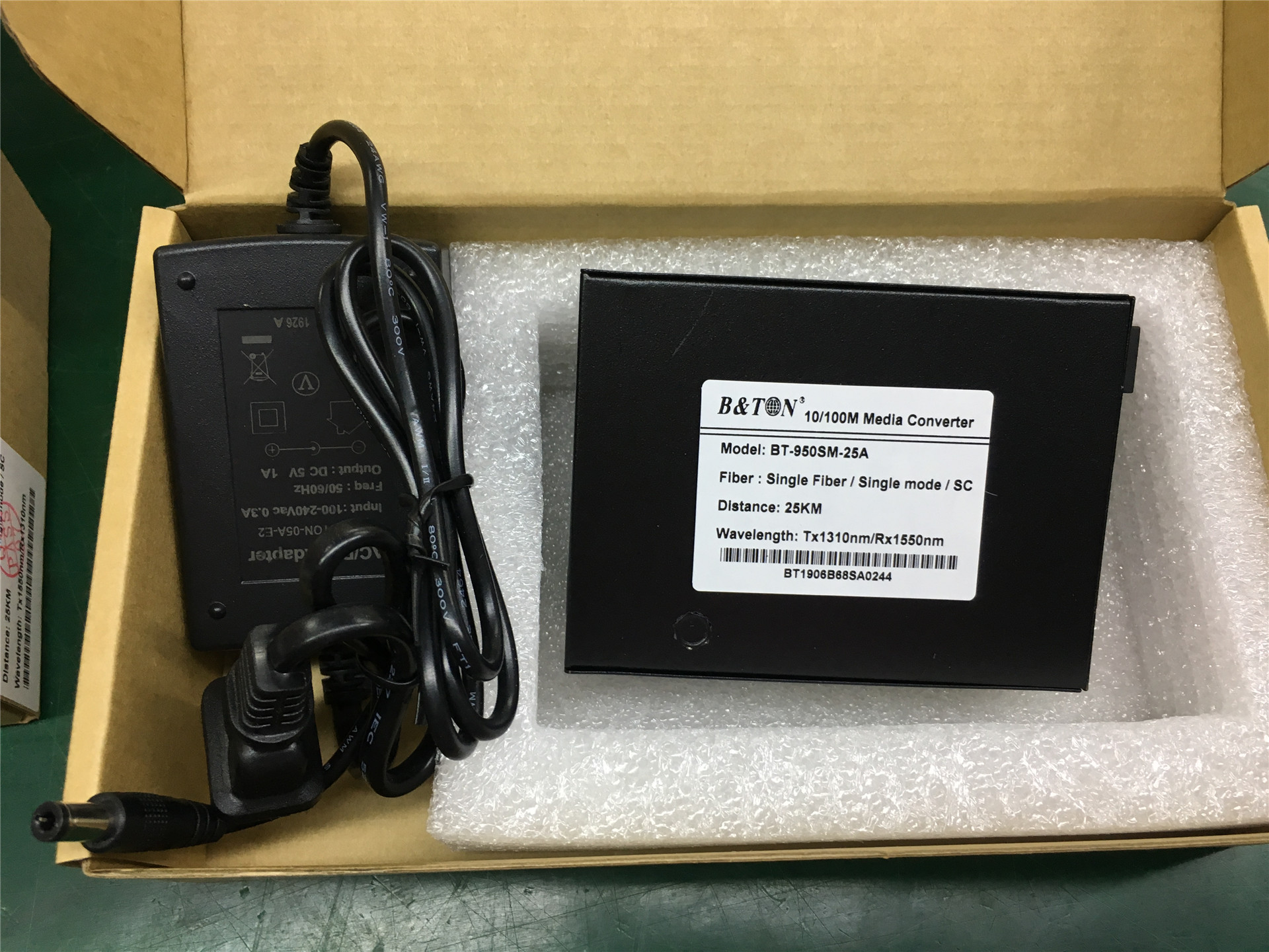 10/100/1000Mbps. Model: BT-950GS-20A/B. Series là một loại thiết bị chuyển đổi quang điện thông minh, adaptive và nhanh Ethernet. Nó có thể thực hiện truyền dữ liệu giữa các tín hiệu điện tử xoắn đôi và tín hiệu quang học là hai loại phương tiện kết nối mạng.Các loại bộ chuyển đổi phương tiện truyền thông có thể mở rộng khoảng cách truyền đến 0,55 km (đa chế độ) hoặc 120 km (một chế độ) bằng cách sử dụng công cụ chuyển đổi phương tiện truyền thông là một giải pháp kinh tế để đạt được cơ sở truyền dẫn đường dài dựa trên tình trạng hiện tại.