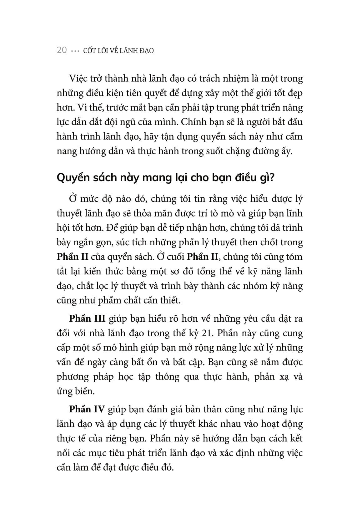Cốt lõi về lãnh đạo sẽ trang bị cho bạn lý thuyết nền tảng và khơi gợi bạn tự suy ngẫm về quá trình lãnh đạo của mình, từ đó có những bước tiến mới trong việc phát triển bản thân và đạt được kết quả mong muốn. Việc trở thành nhà lãnh đạo có trách nhiệm là một trong những điều kiện tiên quyết để dựng xây một thế giới tốt đẹp hơn. Vì thế, trước mắt bạn cần phải tập trung phát triển năng lực dẫn dắt đội ngũ của mình. Chính bạn sẽ là người bắt đầu hành trình lãnh đạo, hãy tận dụng quyển sách này như cẩm nang hướng dẫn và thực hành trong suốt chặng đường ấy.