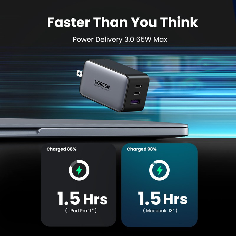 1. Bộ sạc nhanh UGREEN 60495 được Qualcomm chứng nhận chính thức, sạc nhanh các thiết bị tương thích QC 3.0 của bạn từ 0% đến 80% trong 35 phút, nhanh hơn 50% so với