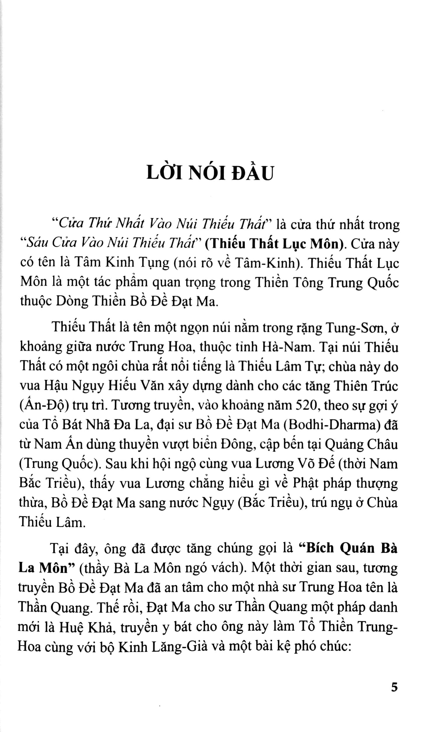 Trong Thiếu Thất Lục Môn tôi cũng lược kể qua: Lục môn là sáu cửa hay sáu pháp môn để vào trong động Thiếu Thất hay trong núi Thiếu Thất. Sáu cửa đó nếu chúng ta nương vào thì đi thẳng đến cái nhà Thiếu Thất. Nhà “Thiếu Thất” tức là thầm chỉ cái nhà mà Tổ Đạt-ma đã ngồi chín năm trong đó. Như vậy, nếu chúng ta đi vào con đường của Tổ Đạt-ma đã đi hay là đến chỗ Tổ Đạt-ma đã đến thì không gì hơn là đi vào sáu cửa này. Tuy nhiên, nêu sáu cửa là phương tiện, thứ lớp để cho chúng ta có mạch lạc tiến chớ còn thực tế ở trong đó một cửa mà chúng ta đạt tới viên mãn thì có thể cũng tới được cái nhà “Thiếu Thất” của Tổ Bồ-đề-đạt-ma rồi. Vì vậy cho nên trong sáu cửa này thì phương tiện chia ra làm sáu để cho có một trình tự tu tiến, chúng ta nhận định từ gần đến xa, từ cạn đến sâu, chớ còn trên thực tế nếu chúng ta ở trong một cửa mà đạt được lý viên mãn thì có thể đã vào được cái nhà “Thiếu Thất”.