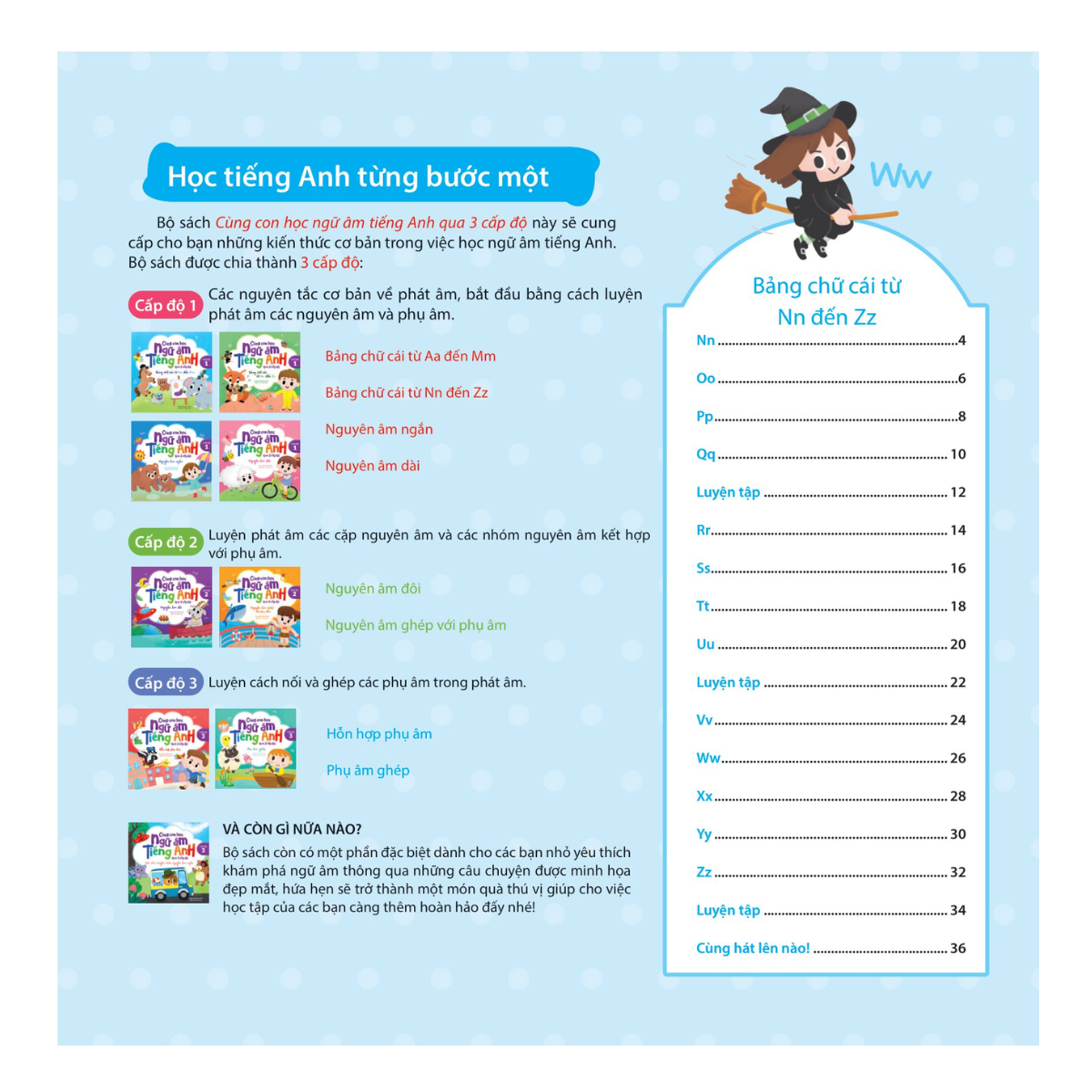 Với những ví dụ sinh động, dễ tiếp thu, kèm theo các bài thực hành nâng cao đầy tính thực tiễn và các audio dạy phát âm chuẩn bằng giọng Anh-Mỹ bản xứ, bộ sách sẽ cung cấp cho các em những kiến thức cần thiết để học ngữ âm tiếng Anh. Đúng như tên gọi, bộ sách được chia thành ba cấp độ từ cơ bản đến phức tạp, hướng dẫn các em rèn luyện từng bước một để nắm chắc các âm trong tiếng Anh. Ngoài ra, bộ sách còn lồng ghép những bài hát vui nhộn và những câu chuyện ngắn được minh họa đẹp mắt, hứa hẹn sẽ giúp cho việc học tập của các em thêm phần thú vị và hiệu quả.