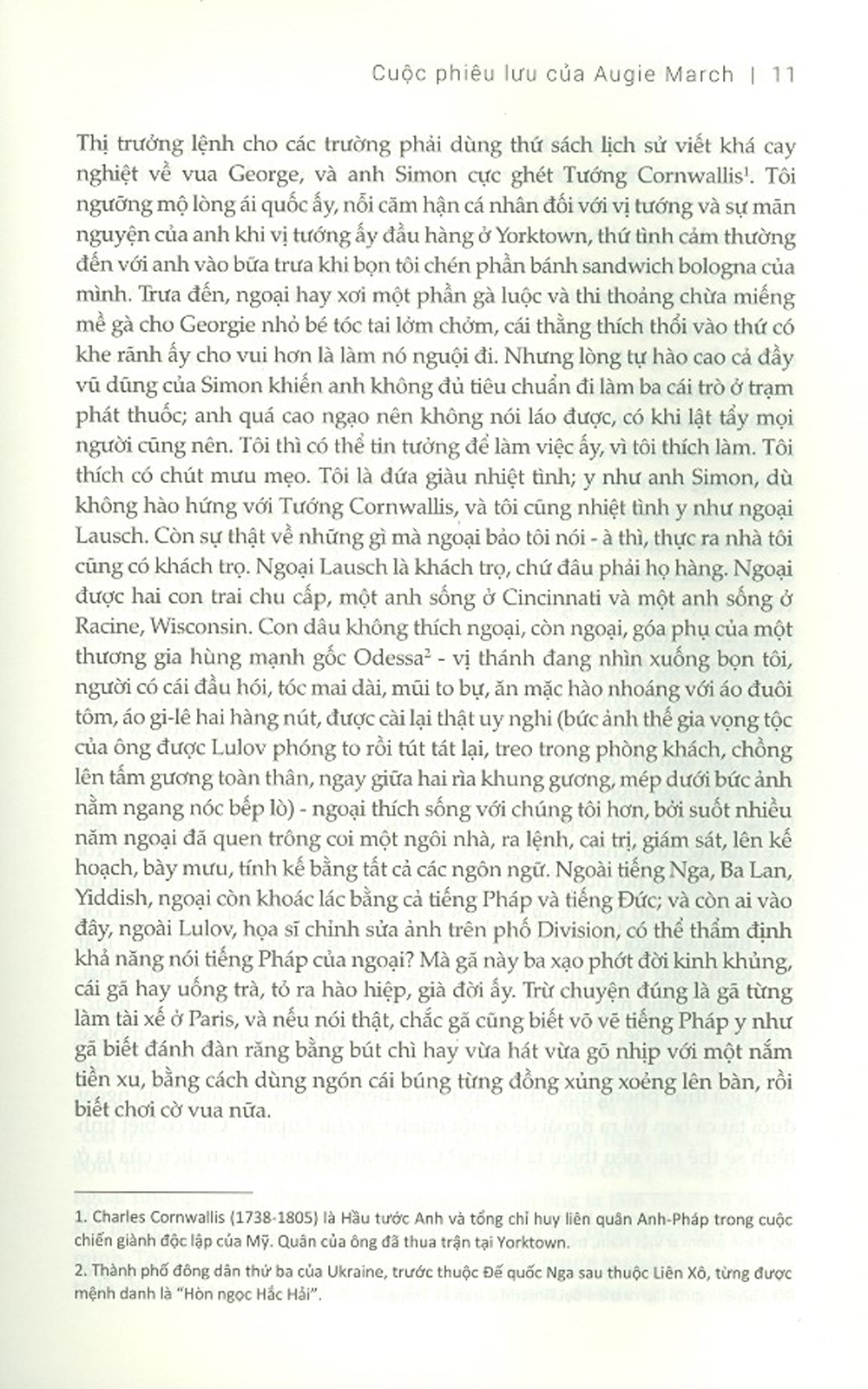 Với Cuộc phiêu lưu của Augie March, Saul Bellow đã kể lại hành trình độc nhất vô nhị của người hùng du đãng picaresque Augie March: một thanh niên thậm duyên dáng, một kẻ cơ hội chủ nghĩa xảo trá, một gã khờ trong lưới tì Rời bỏ xuất thân Do Thái di cư nghèo khổ, Augie March hăm hở bước vào công cuộc tìm kiếm lẽ sống của đời mình dưới các ống cống và nhà ga tại Chicago, quẩn quanh những trường đại học ở New York, hay ngoài rừng rậm Mexico giữa bầy thằn lằn hoang dã Hành trình phi thường của Augie March là biểu tượng cho sự tái sinh lý tưởng tự do của giấc mơ Mỹ, và đặc biệt hơn, đã “viết lại” ngôn ngữ của cả một thế hệ.