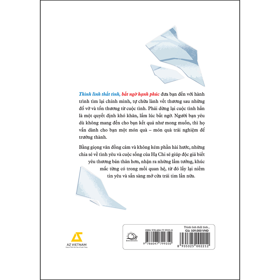 Thất tình hẳn là một biến cố mang đến nhiều tổn thương. Bởi lẽ, trái tim biết yêu thì cũng sẽ biết đau. Lắm lúc, bạn tưởng chừng mình không thể vượt qua, không thể sống nổi nếu thiếu người đó, dằn vặt mình trong những nỗi đau cùn mòn. Nhưng tin tốt lành là khả năng hồi phục của trái tim là vô cùng tận. Và cuốn sách này sẽ là liều thuốc giúp bạn vượt qua thất tình. Thình lình thất tình, bất ngờ hạnh phúc của Hạ Chi (người viết, có hơn mười năm kinh nghiệm trong lĩnh vực báo chí – quảng cáo) sẽ đưa bạn đến với hành trình tìm lại chính mình, tự chữa lành vết thương sau những đổ vỡ. Người bạn yêu dù không mang đến kết quả như mong muốn, thì họ vẫn dành cho bạn một món quà – món quà trải nghiệm để trưởng thành. Bằng giọng văn đồng cảm nhưng cũng không kém phần hài hước, những chia sẻ về tình yêu và cuộc sống của Hạ Chi sẽ truyền sự lạc quan, giúp độc giả tìm thấy chính mình, nhận ra những lầm tưởng, khúc mắc từng có trong mối quan hệ, từ đó lấy lại niềm tin yêu và sẵn sàng mở cửa trái tim lần nữa. “Mỗi mẩu chuyện trong Thình lình thất tình, bất ngờ hạnh phúc đều đủ sâu sắc để chạm đến nỗi buồn, đủ hóm hỉnh để ta bật cười và đón nhận câu trả lời thật nhẹ nhàng. Độc giả nữ sẽ được dìu dắt qua từng trang viết, biết tự vun vén cho khu vườn tâm hồn, không đợi mỏi mòn một gã ất ơ nào mang hoa đến. Còn độc giả nam thì chắc sẽ được giải ngáo phần nào về vũ trụ xinh đẹp đang kề cận mình và hơn hết là biết cách trao yêu thương một cách tinh tế hơn! (dù vẫn ngáo)”- nhận xét từ tác giả Huỳnh Vĩnh Sơn (Sói Ăn Chay). Sách được phát hành bởi thương hiệu sách Wavebooks với sứ mệnh trở thành người bạn đồng hành tin cậy cho quá trình phát triển kỹ năng và tâm hồn người Việt trẻ.