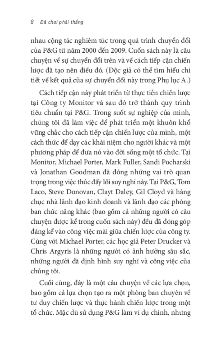 "Đã chơi phải thắng" bàn về cách kinh doanh để thành công dựa trên những ví dụ thực tiễn từ công ty P&G. Quyển sách nêu lên năm lựa chọn, một khuôn khổ và một quy trình, tạo nên một cẩm nang xây dựng chiến lược trong bất kỳ tổ chức nào. Độc giả có thể coi đây là một quyển hướng dẫn để tự mình thực hiện chiến lược. Hai tác giả A. G. Lafley, Cựu chủ tịch và CEO, Procter & Gamble và Roger L. Martin, Hiệu trưởng Trường Quản lý Rotman cung cấp các khái niệm, quy trình và công cụ thực tế mà bạn cần để tạo ra và phát triển một chiến lược thành công cho doanh nghiệp, bộ phận chức năng hoặc tổ chức của mình – một chiến lược có thể phục vụ khách hàng của bạn tốt hơn và cho phép bạn cạnh tranh thành công hơn và giành chiến thắng. Thế giới cần nhiều hơn những nhà lãnh đạo doanh nghiệp am hiểu chiến lược và có khả năng dẫn dắt quá trình xây dựng chiến lược cho công ty của họ. Điều đó cần đến các năng lực chiến lược ở tất cả các cấp độ tổ chức trong mọi loại ngành nghề, trong chính phủ, trong lĩnh vực chăm sóc sức khỏe, trong giáo dục và trong lĩnh vực xã hội. Chiến lược không nhất thiết là một điều gì đó bí ẩn. Về mặt khái niệm, nó đơn giản và dễ hiểu. Nó đòi hỏi tư duy rõ ràng và cặn kẽ, sự sáng tạo thực sự, lòng dũng cảm và khả năng lãnh đạo cá nhân. Nhưng nó là điều có thể thực hiện được.