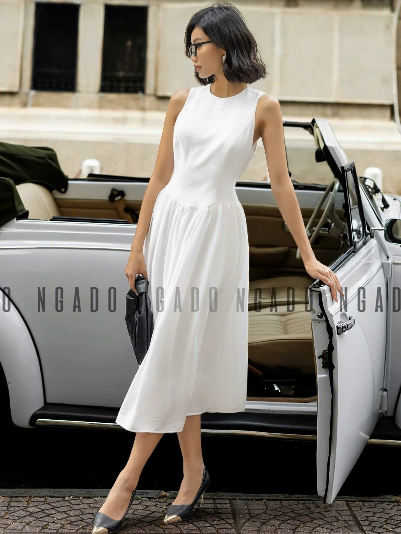 ✨Đầm trắng xoè cổ tròn sát nách NGADO , đầm nữ , Đầm xòe nữ sát nách