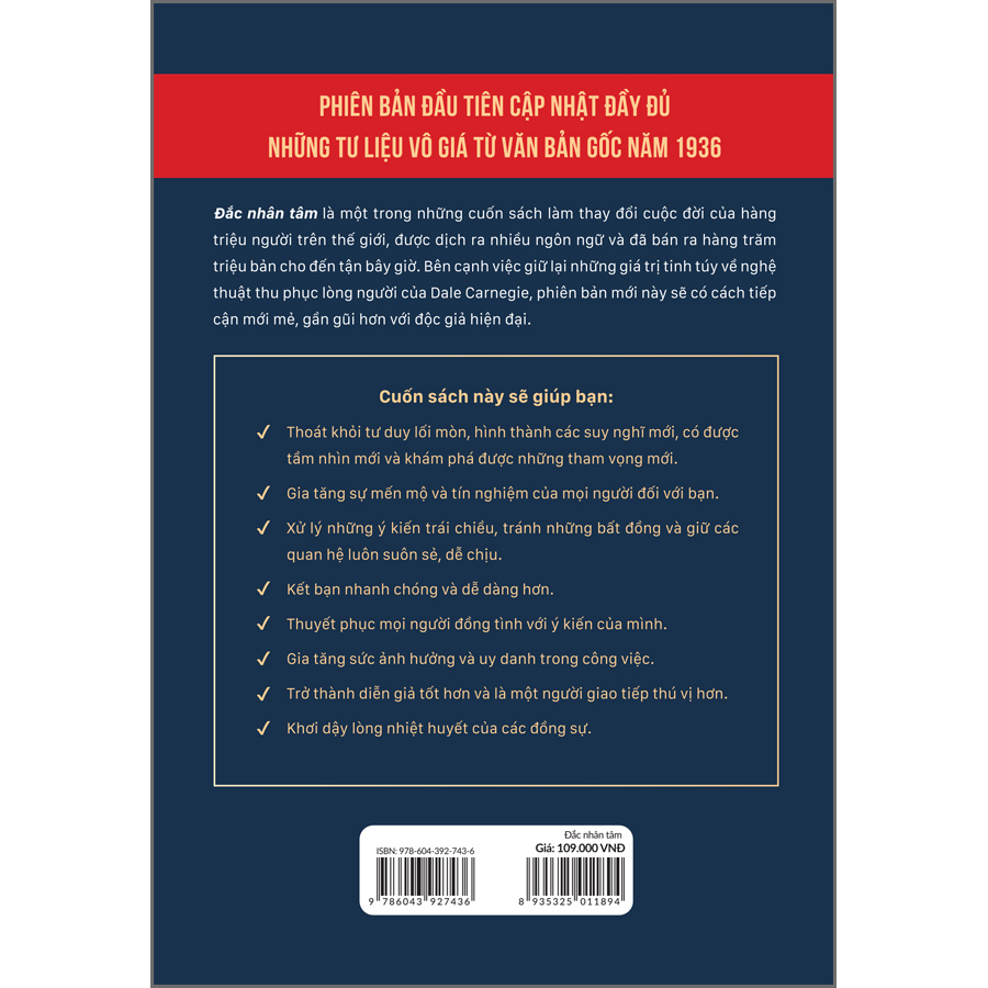 Dale Carnegie từng nói, việc kiếm được một triệu đô la vẫn dễ hơn thêm một cụm từ vào từ điển tiếng Anh. Vậy mà Đắc nhân tâm đã trở thành một cụm từ như thế: được trích dẫn, diễn giải, tái chế; được sử dụng trong vô số bối cảnh, từ phim hoạt hình, chính trị cho tới tiểu thuyết. Bản thân cuốn sách cũng được dịch sang hầu hết các ngôn ngữ được biết đến trên thế giới. Mỗi thế hệ lại khám phá tác phẩm theo một cách hoàn toàn mới và tìm ra những giá trị vẫn hữu dụng trong thời đại của họ.