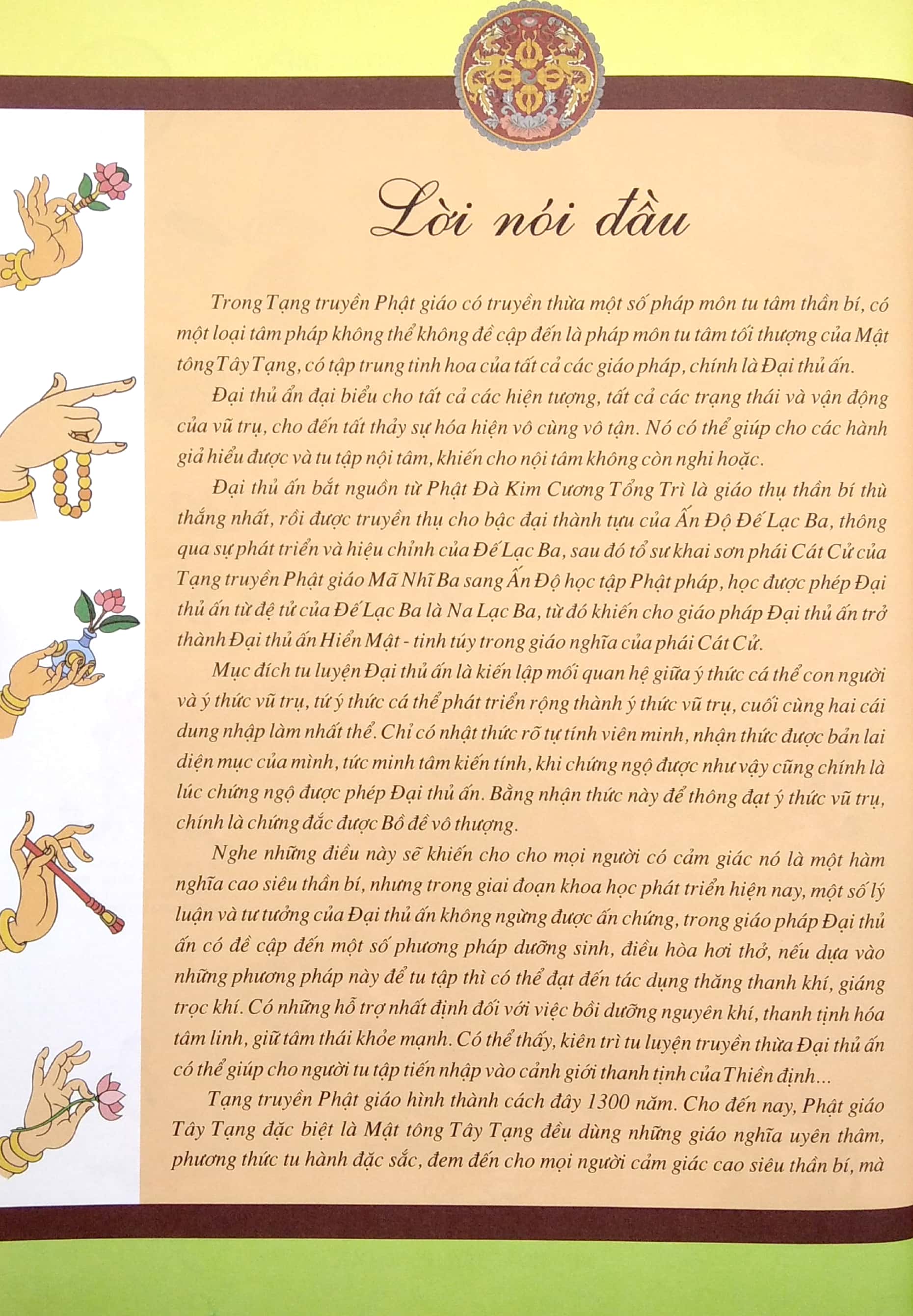 Tạng truyền Phật giáo hình thành cách đây 1300 năm. Cho đến nay, Phật giáo Tây Tạng đặc biệt là Mật tông Tây Tạng đều dùng những giáo nghĩa uyên thâm, phương thức tu hành đặc sắc, đem đến cho mọi người cảm giác cao siêu thần bí, mà Đường Ca là hòn ngọc của văn hóa cao nguyên Tây Tạng, đề tài của trang thêu Đường Ca bao gồm nhiều phương diện tôn giáo, lịch sử, dân tộc, tư tưởng quan niệm, được xem là bách khoa toàn thư của Tây Tạng. Trong những bức tranh thêu Đường Ca đầy màu sắc có phản ánh pháp tu Tạng Mật hay không? Cuốn sách Đại Thủ Ấn - Tức Thân Thành Phật đã sử dụng nhiều tư liệu tranh thêu Đường Ca, đề cập lịch sử truyền thừa của Đại thủ ấn, sự phát triển cảu phái Cát Cử, các tổ sư truyền thừa Đại thủ ấn, cho đến những bậc đại thành tựu thông qua Đại thủ ấn đạt được sự chứng ngộ, bốn phương diện của phép tu Đại thủ ấn, sáu pháp thành tựu Nông qua những bức tranh thêu Đường ca tinh xảo, quý giá, phần nào giúp bạn hiểu được tâm pháp của Mật tông.
