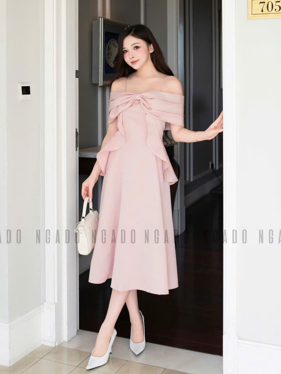 ✨Đầm hồng 2 dây trễ vai NGADO , đầm dài , đầm dự tiệc