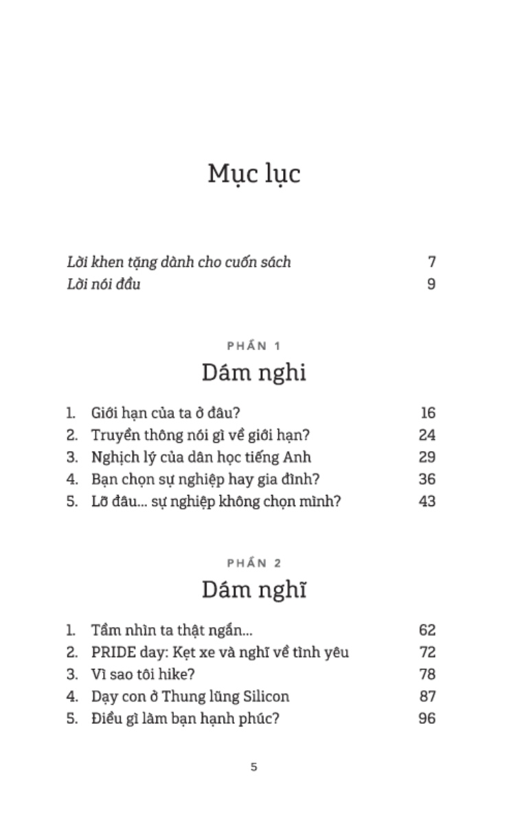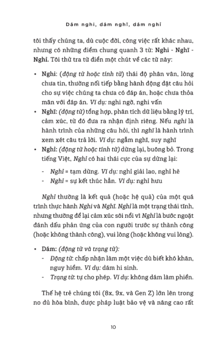… Các mẩu chuyện nhỏ trong cuốn sách này có màu sắc chung là câu chuyện về những lựa chọn. Truyền thống hay phi truyền thống, mới hay cũ, tốt hay xấu, đúng hay sai là những đánh giá không có tính tuyệt đối. Chúng tùy thuộc vào hệ quy chiếu lăng kính, đối tượng, thời gian mà bạn chọn. Dám Nghi – Dám Nghĩ – Dám Nghỉ khuyến khích bạn gieo một sự hoài nghi vừa vặn để thôi thúc bạn đi tìm câu trả lời với một cái đầu mở, một trái tim nhạy cảm hồn nhiên để biết nghĩ cho bản thân cũng như cho người khác, và một sự dũng cảm để bỏ đi giá trị không còn đúng người đúng chỗ. Khi nói đến “Dám”, tôi cổ vũ sự thử nghiệm chừng mực và đề cao việc cân nhắc an toàn. Nói cách khác, tôi khuyến khích sự thử nghiệm liều lĩnh bứt phá theo tinh thần của các môn thể thao mạo hiểm: bạn nên trang bị thiết bị bảo hộ cần thiết, hỏi ý kiến chuyên gia và người có hiểu biết về pháp luật trước khi bắt đầu. Bạn cũng nên dự trù phương án xử lý sự cố. Dám nghi, dám nghĩ, dám nghỉ, hay dám hành động gì đi nữa chung quy cũng chỉ là để làm cho quỹ thời gian hữu hạn mỗi ngày trong cuộc đời này trở nên ý nghĩa nhất vì thời gian là nguồn tài nguyên quý giá nhất và không thể tái tạo lại của mỗi người. Tôi cảm ơn bạn vì đã dành thời gian cho quyển sách này.”