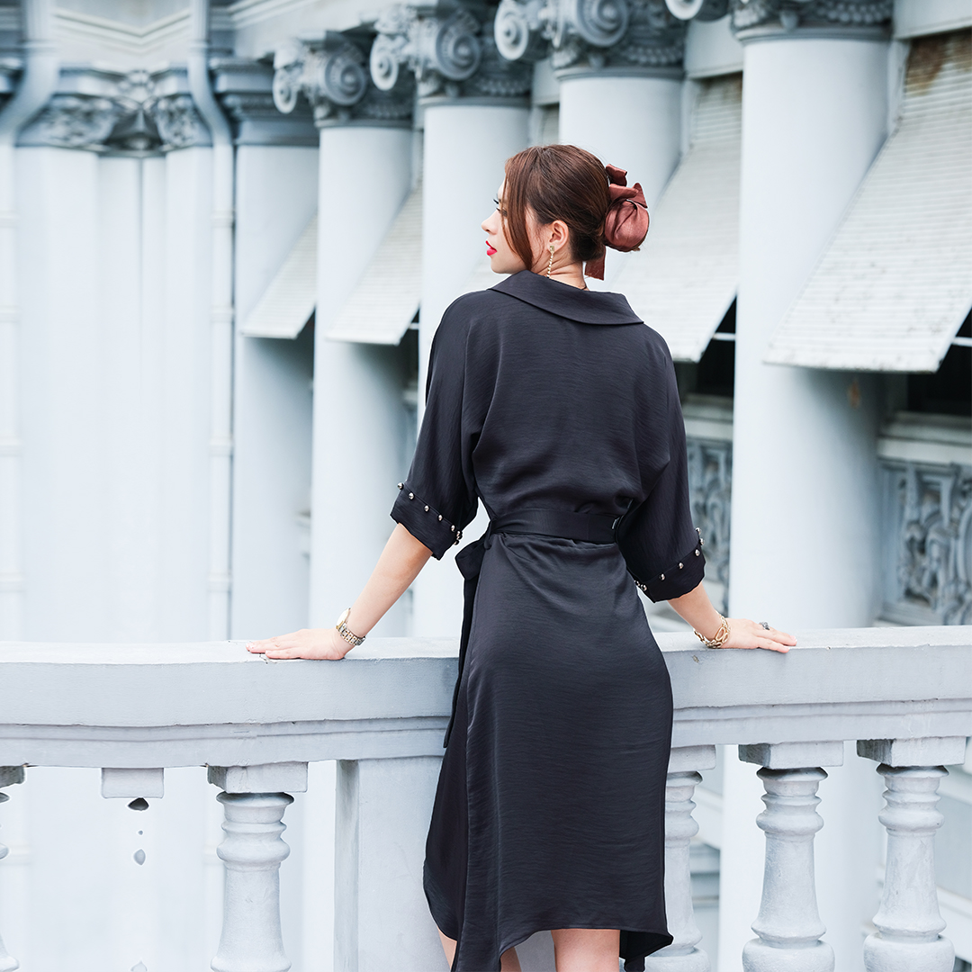 - kiểu dáng đầm suông nhấn eo thoải mái bằng dây thắt lưng rời - tay liền, điểm ngọc trai xám - cổ lá sen rộng, nhấn cùng hàng nút cài trước - tà