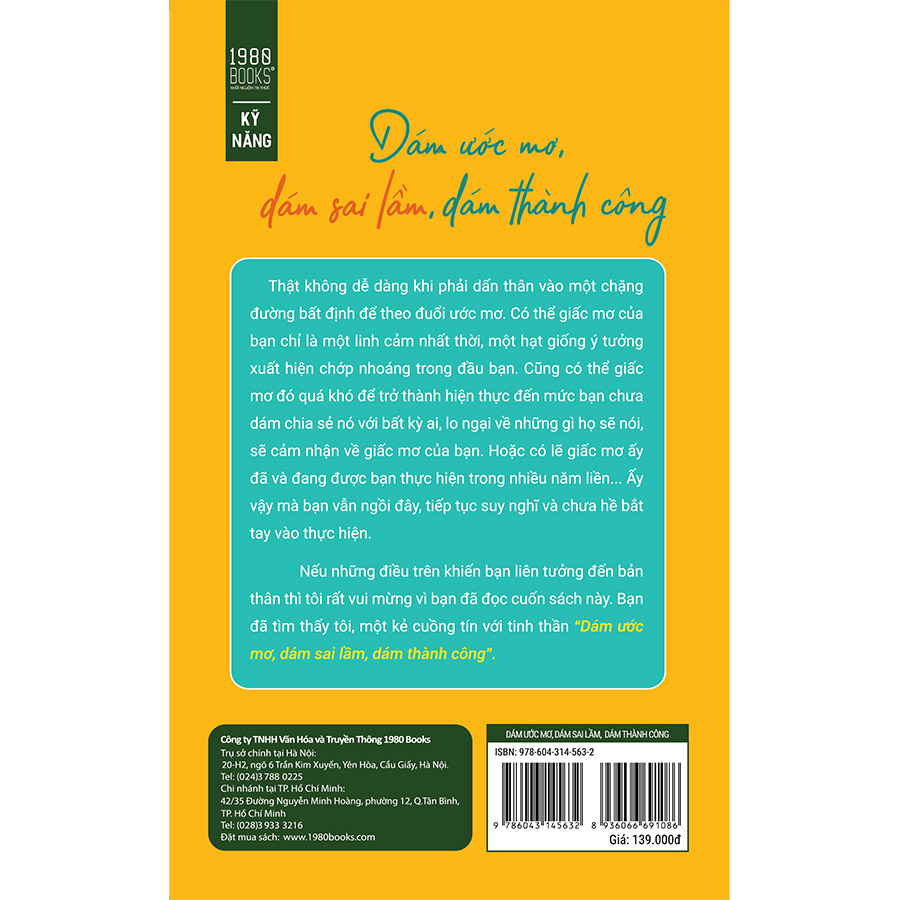 “Dám ước mơ, dám sai lầm, dám thành công” là cuốn tự truyện của Ellen Bennett - người sáng lập và Giám đốc điều hành của Hedley & Bennett, thương hiệu tạp dề và dụng cụ nhà bếp chuyên phục vụ cho nhiều đầu bếp giỏi nhất trên thế giới. Những chia sẻ chân thực và tâm đắc của Bennett sẽ giúp bất kỳ ai đang trì hoãn mục tiêu, thay đổi nghề nghiệp hoặc ý tưởng kinh doanh dừng lại nỗi lo ám ảnh và bắt tay vào hành động. Cuộc sống vốn dĩ nhiều chông gai, nhưng đừng sợ hãi, thay vào đó hãy: