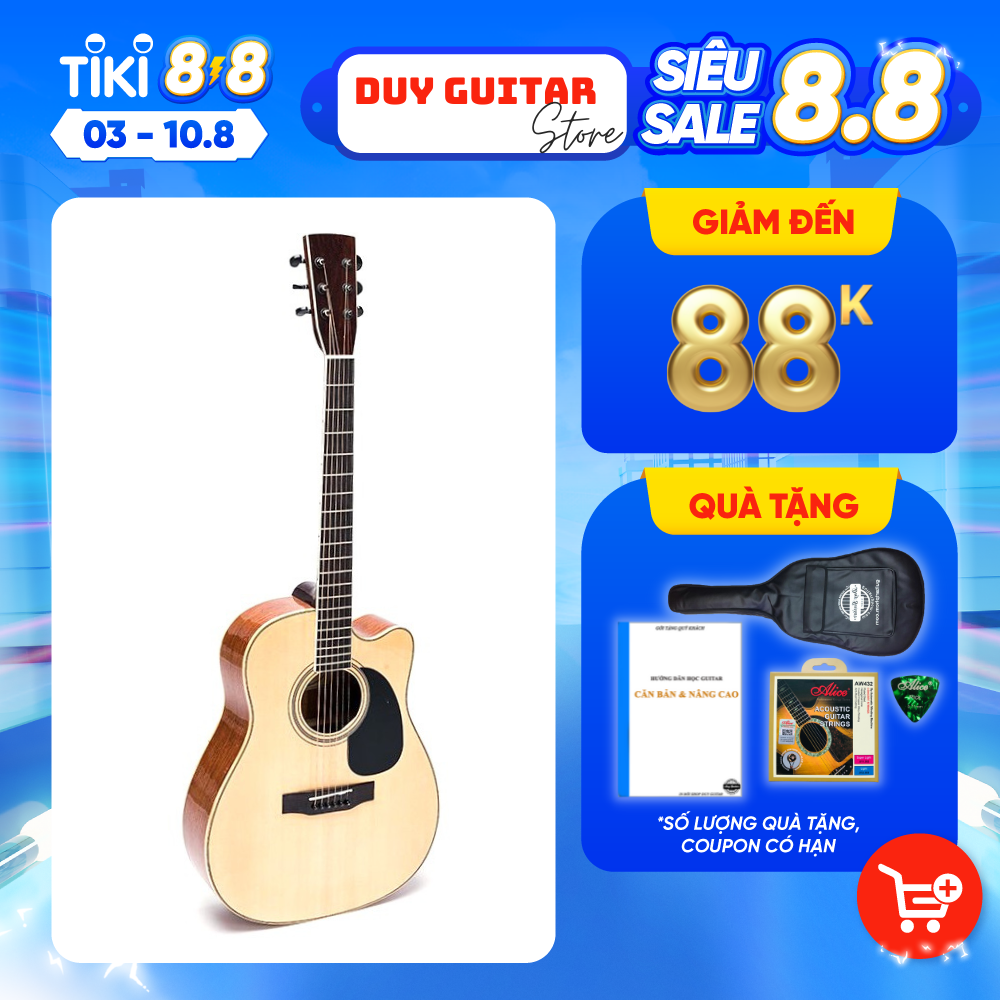 Mua tại TiktokMặt: Gỗ Thông Sitka Eo + lưng: Gỗ Hồng Đào cao cấp. Cần: Gỗ Giá Tỵ, bọc chỉ tút, có ty chống cong cần. Mặt phím: Gỗ Đen Ngựa: Gỗ Mun Dây: Alice AW432 Khóa vặn: Japan Bảo hành: 1 năm. Tặng kèm: bao da 3 lớp, pick, bộ dây, sách hướng dẫn tự học guitar