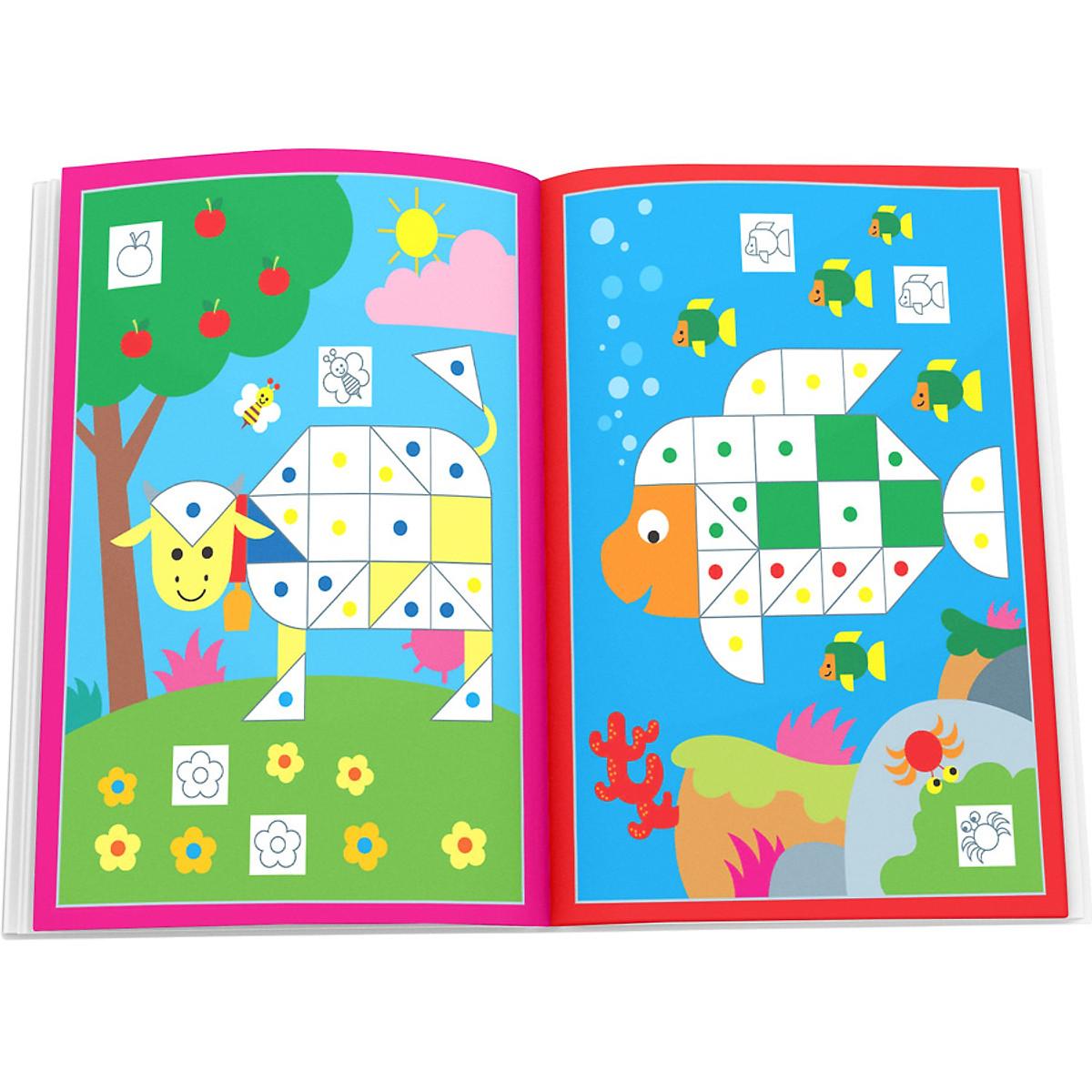 Trong mỗi cuốn sách chơi mà học này, trẻ sẽ thấy 8 bức tranh và các bức tranh ấy sẽ đẹp hơn rất nhiều nếu trẻ dùng các mảnh giấy được dính ở giữa sách để ghép vào những chỗ chưa có màu. Bằng việc chọn ra những mảnh giấy có hình dáng và màu sắc như được hướng dẫn trong mỗi bức tranh và dính vào đúng vị trí, trẻ sẽ hoàn thiện được các bức hình ngộ nghĩnh, sống động về thiên nhiên, cuộc sống. Bạn cũng có thể tham gia cùng trẻ, để trẻ thêm tự tin, hứng thú và sáng tạo tốt hơn.
