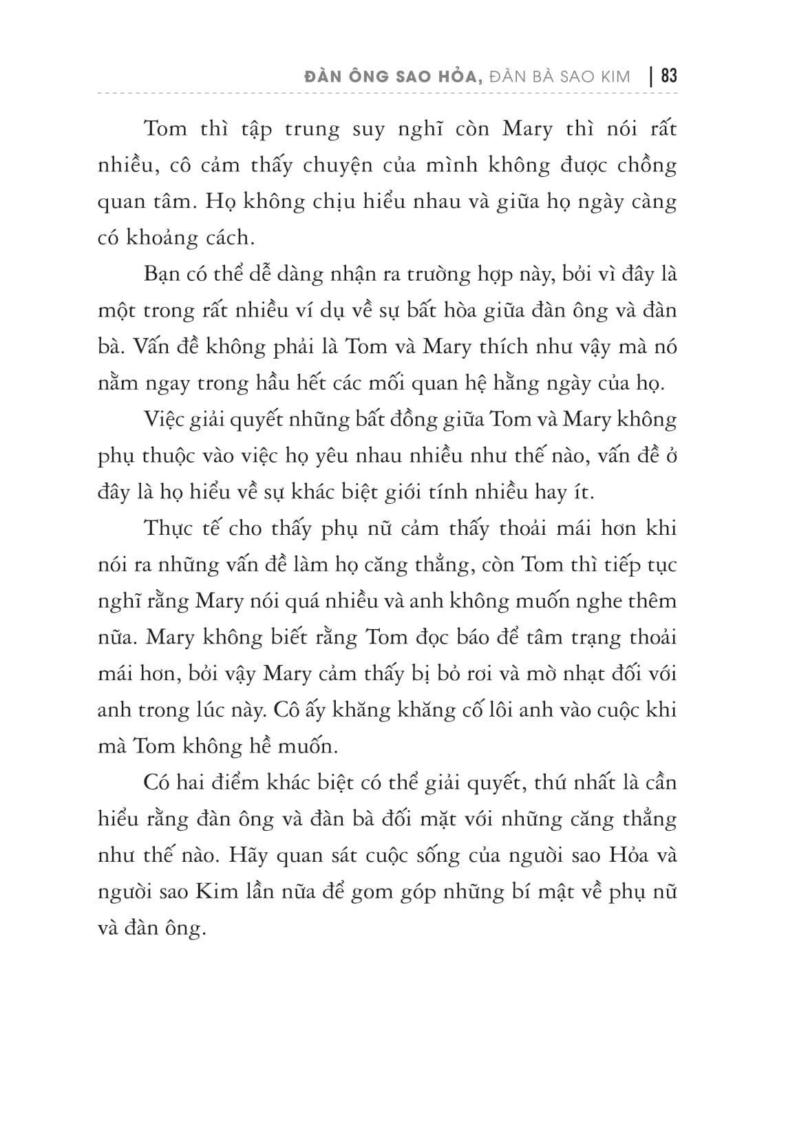 Cuốn sách này thực sự đã giúp đỡ cho hàng triệu độc giả, trong đó có tôi và chắc chắn cũng sẽ có bạn. Nếu không có những ý niệm mới mẻ này thì chưa chắc tôi đã có được cuộc hôn nhân hạnh phúc như hiện nay hay có thể trở thành một người cha giàu đức hy sinh đối với các con của mình như vậy. Những vướng mắc trong mối quan hệ với vợ cách đây hai mươi năm đã từng làm tôi tức điên lên, hiện giờ thi thoảng nó vẫn thường xảy ra. Nhưng điều khác biệt là tôi đã biết khoan dung hơn, chấp nhận và thấu hiểu hơn. Tôi có thể hiểu những lời lẽ và phản ứng của vợ tôi theo cách khách quan hơn, đồng thời tôi biết cách nên đáp lại như thế nào. Có thể tôi là một chuyên gia trong lĩnh vực giao tiếp và sự khác biệt về giới tính, tuy nhiên, đối với Bonnie và các cô con gái của tôi thì việc để hiều được họ vẫn còn là những bí ẩn. Dù vậy, cuốn sách này có thể giúp chúng ta trở nên khoan dung và biết tha thứ khi ai đó không đáp lại theo cách mà ta mong đợi. May mắn thay, để xây dựng những mối quan hệ bền đẹp, tính hoàn hảo không phải là điều kiện bắt buộc.