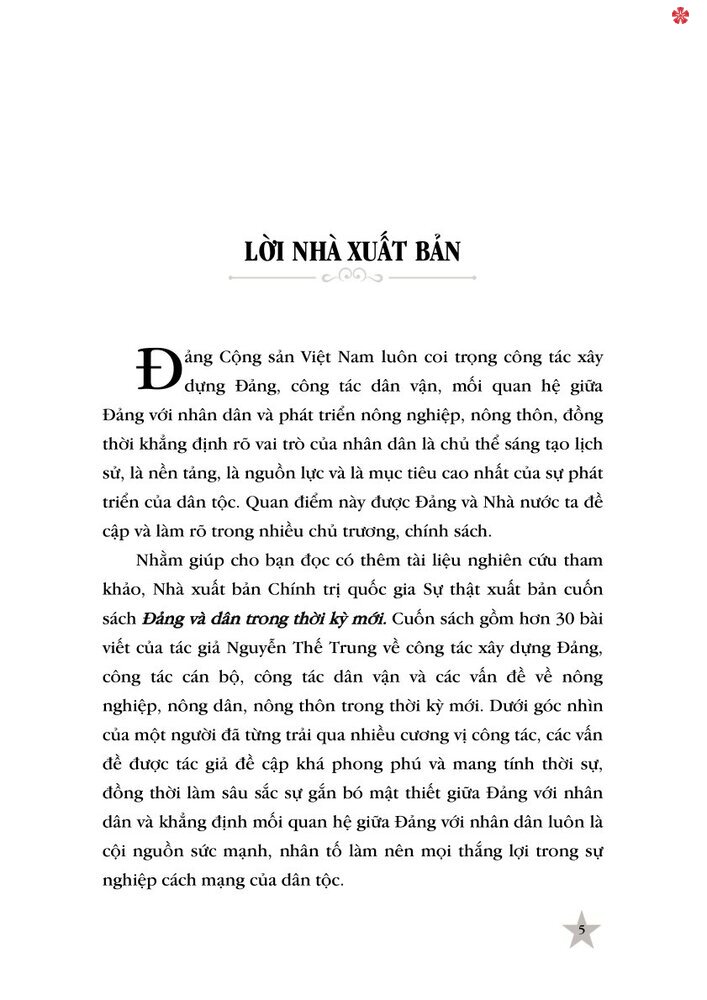 Mua tại TiktokNhằm giúp cho bạn đọc có thêm tài liệu nghiên cứu tham khảo, Nhà xuất bản Chính trị quốc gia Sự thật xuất bản cuốn sách Đảng và dân trong thời kỳ mới.Cuốn sách gồm hơn 30 bài viết của tác giả Nguyễn Thế Trung về công tác xây dựng Đảng, công tác cán bộ, công tác dân vận và các vấn đề về nông nghiệp, nông dân, nông thôn trong thời kỳ mới. Dưới góc nhìn của một người đã từng trải qua nhiều cương vị công tác, các vấn đề được tác giả đề cập khá phong phú và mang tính thời sự, đồng thời làm sâu sắc sự gắn bó mật thiết giữa Đảng với nhân dân và khẳng định mối quan hệ giữa Đảng với nhân dân luôn là cội nguồn sức mạnh, nhân tố làm nên mọi thắng lợi trong sự nghiệp cách mạng của dân tộc.