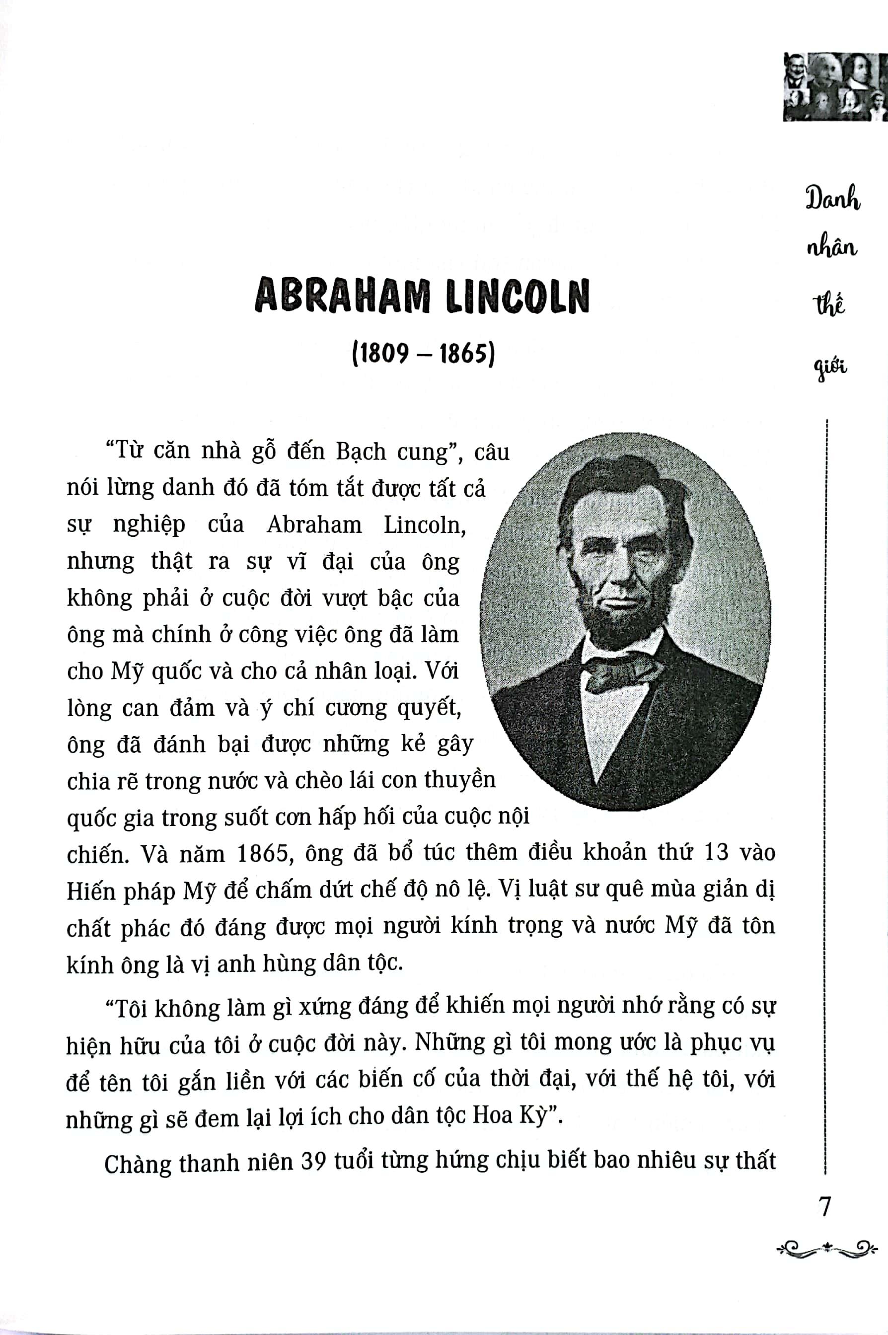 Cuốn sách Danh Nhân Thế Giới sẽ giới thiệu đến bạn đọc những nhân vật nổi tiếng thế giới. Họ là những nhà quân sự, chính trị đại tài, nhà văn hóa, những nhà bác học tên tuổi và nổi tiếng. Danh tiếng của họ mãi mãi lưu danh sử sách. Tên tuổi, cuộc đời và sự nghiệp của những người này là những bản hùng ca độc đáo trong cuộc sống vĩnh hằng với những thất bại, thành công, những đắng cay cùng cực, những khổ ải mà họ đã đi qua, để lại cho hậu thế mai sau những thành công vĩ đại.