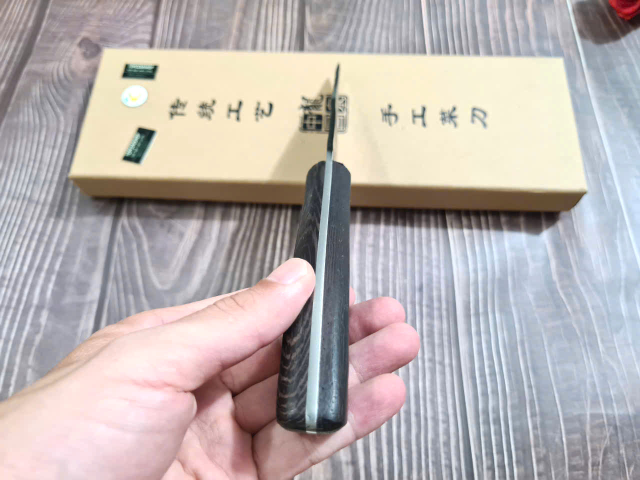 - Chức năng: thái thịt, rau củ quả - Kích thước: Lưỡi: 17cm, cán: 12cm, rộng: 5cm, dầy: 1ly, trọng lượng: 200g - Cán : Gỗ cẩm chỉ, Chốt, Khâu ĐỒNG ĐỎ , keo liên