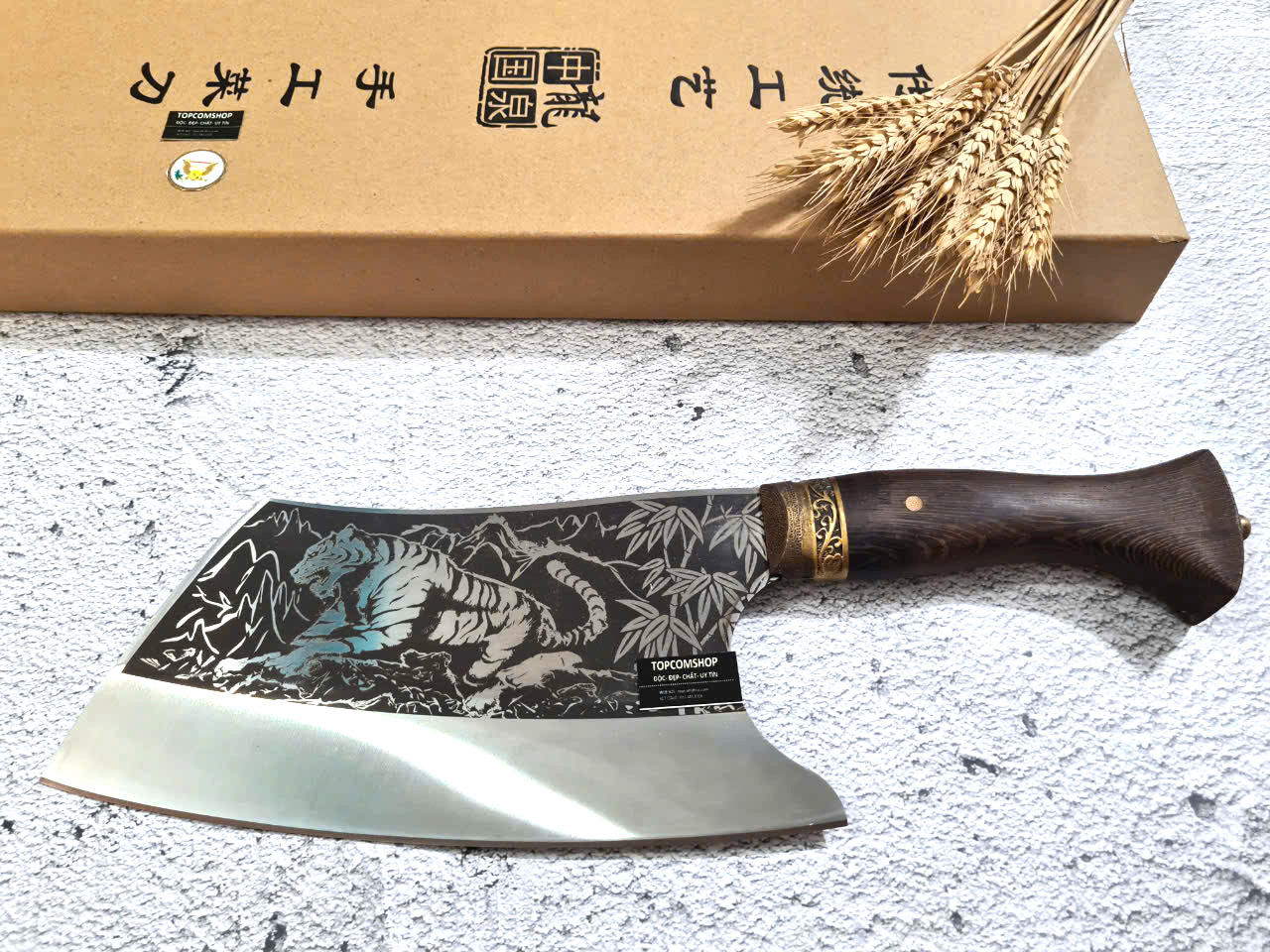 - Chức năng: Chặt xương ống, chân giò, trâu bò - Kích thước: Lưỡi: 22cm, cán: 10cm, rộng: 10cm, dầy: 5ly, trọng lượng: 800g - Cán : Gỗ mun, Khâu đồng đỏ , chốt đinh