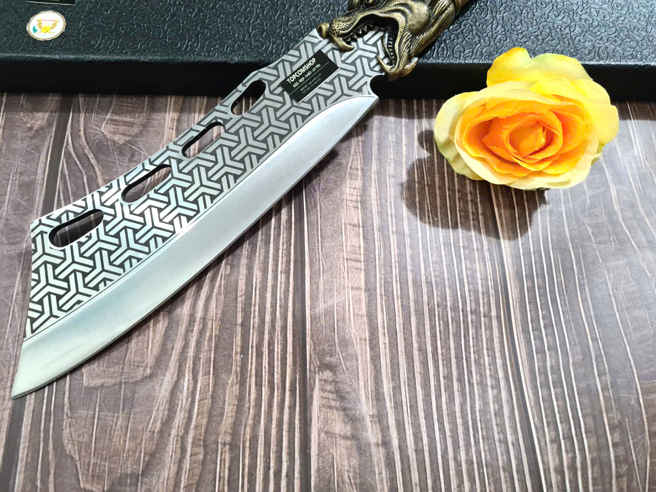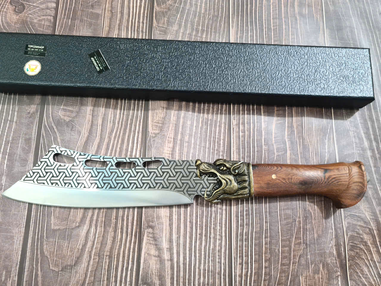 - DAO TR12 : Chiều dài TỔNG: 45cm Chiều dài lưỡi: 24.5cm Chiều rộng lưỡi: 7.5cm, Độ dày lưỡi: 6mm Trọng lượng: 1kg chất liệu lưỡi : 7Cr17MOV (thép 7 crom 17 molypden vanadi) Chất liệu tay cầm: gỗ cẩm lai, phụ kiện khâu đầu hổ và chuôi bằng đồng