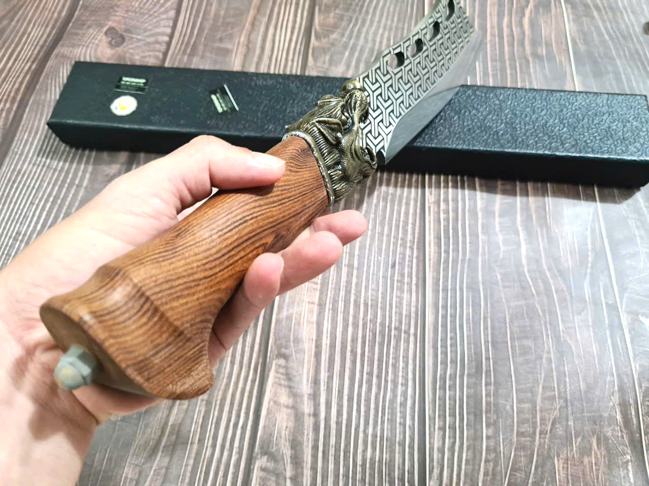 - Chức năng: Chặt xương ống, chân giò, trâu bò - Kích thước: Lưỡi: 22cm, cán: 10cm, rộng: 10cm, dầy: 5ly, trọng lượng: 800g - Cán : Gỗ mun, Khâu đồng đỏ , chốt đinh