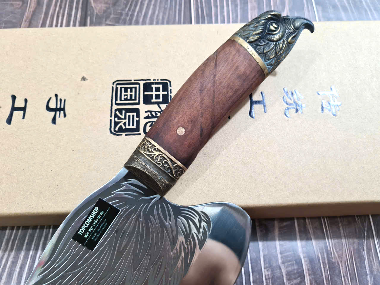 Chất liệu tay cầm: gỗ CẨM LAI, khâu và chuôi cuối dao bằng đồng thau