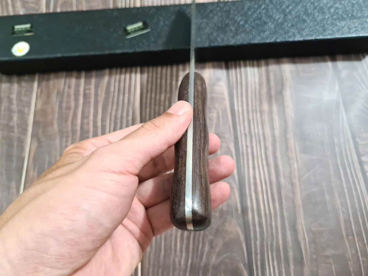 - Chất liệu: 100% thép nhíp ô tô được lựa chọn và kiểm duyệt kỹ càng. - Chất liệu cán: gỗ cẩm chỉ núi - Kích thước: lưỡi: 18cm, cán: 12cm, rộng: 6,5cm, dầy: 0,1,