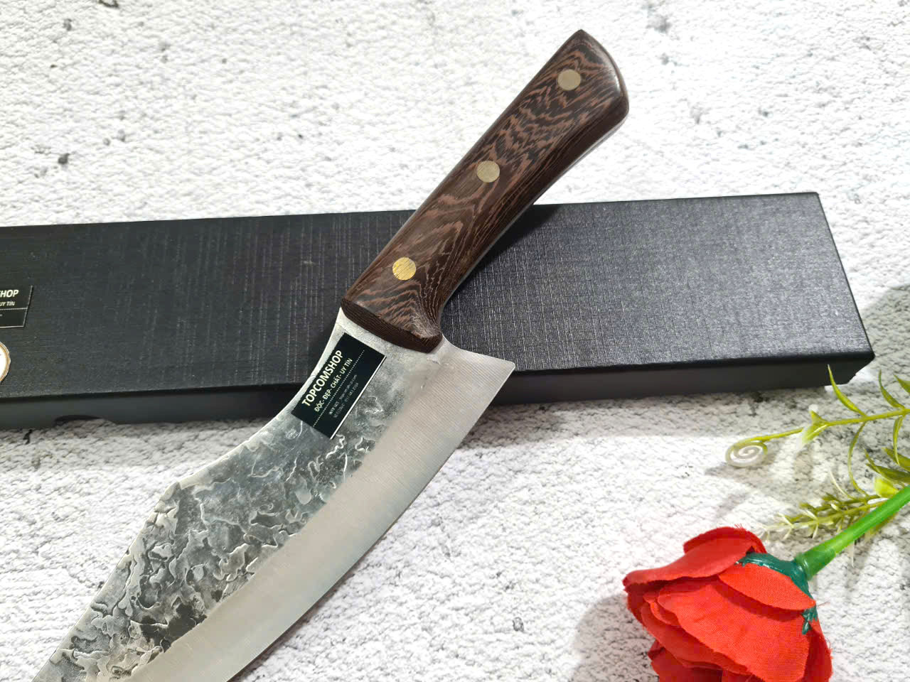 -THÔNG TIN SẢN PHẨM: Chiều dài tổng thể: 29.5cm, Chiều dài lưỡi: 19.5cm ,Chiều rộng lưỡi: 5cm Độ dày: 2.5MM, CHẤT liệu lưỡi: 5Cr15MOV (thép 5 crom 15 molypden vanadi) Chất liệu CÁN: gỗ Cánh gà NẶNG : 2.5 lạng Mặt D dập chìm hoa văn rất đẹp