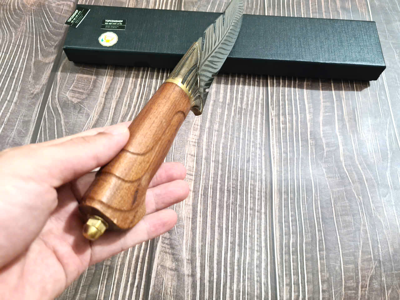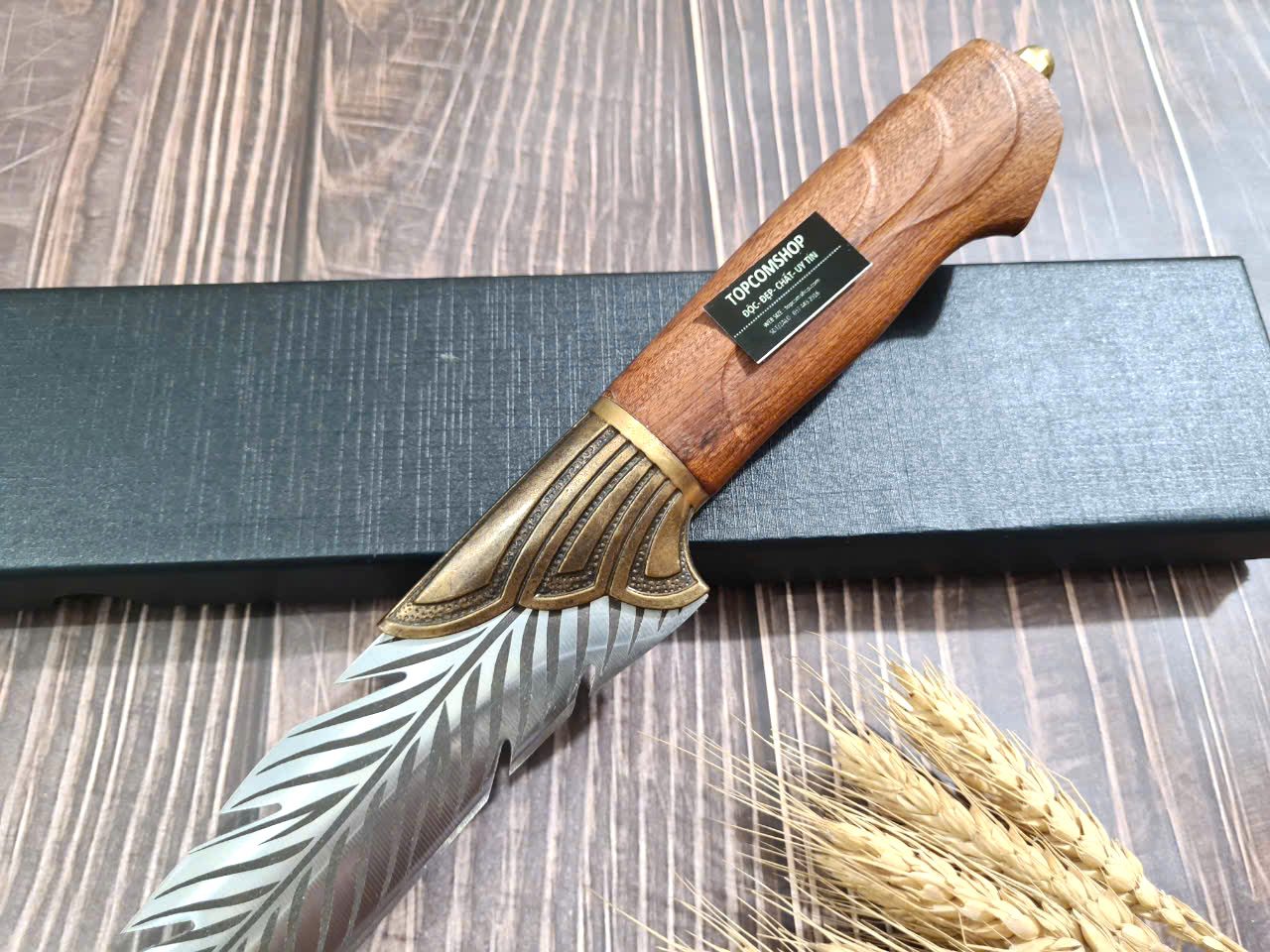 THÔNG TIN SẢN PHẨM TỔNG DÀI : 33cm, LƯỠI: 16.5cm,CÁN: 12cm ,RỘNG : 3,6cm, dày: 2.5mm, CHẤT liệu lưỡi: 7Cr17MOV (thép 7 crom 17 molypden vanadi) Chất liệu CÁN: gỗ cẩm lai, Các phụ kiện ( khâu ) : đồng thau NẶNG : 3 lạng