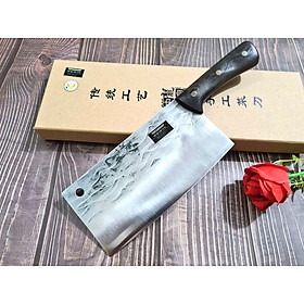 - Chức năng: Chặt xương ống, chân giò, trâu bò - Kích thước: Lưỡi: 22cm, cán: 10cm, rộng: 10cm, dầy: 5ly, trọng lượng: 800g - Cán : Gỗ mun, Khâu đồng đỏ , chốt đinh