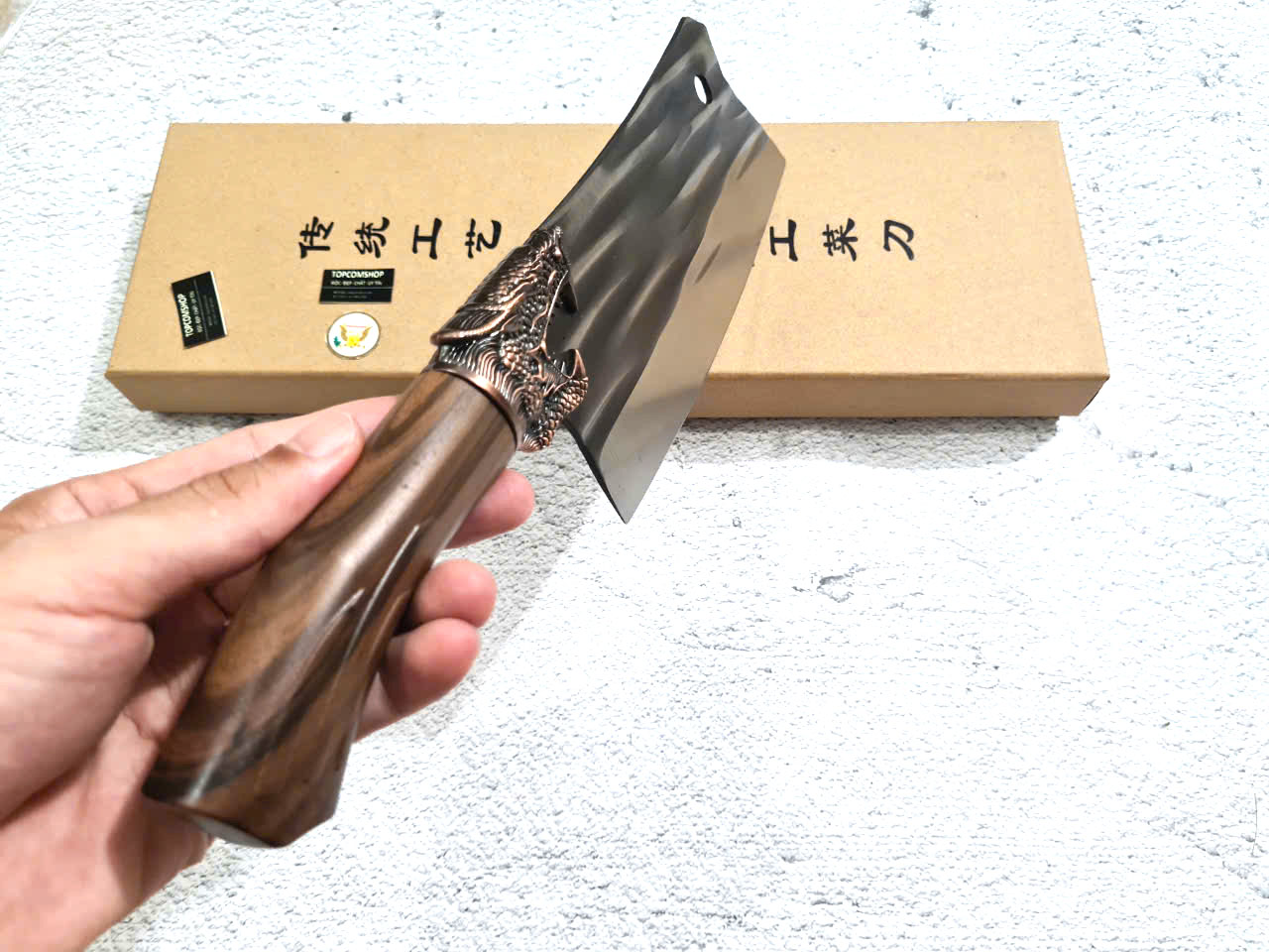 - Chức năng: Chặt xương ống, chân giò, trâu bò - Kích thước: Lưỡi: 22cm, cán: 10cm, rộng: 10cm, dầy: 5ly, trọng lượng: 800g - Cán : Gỗ mun, Khâu đồng đỏ , chốt đinh