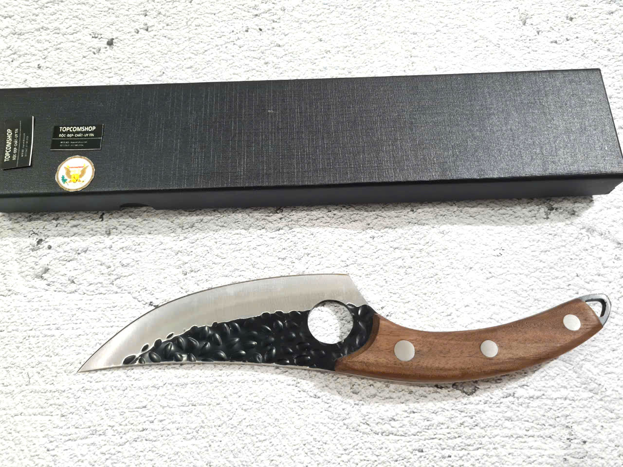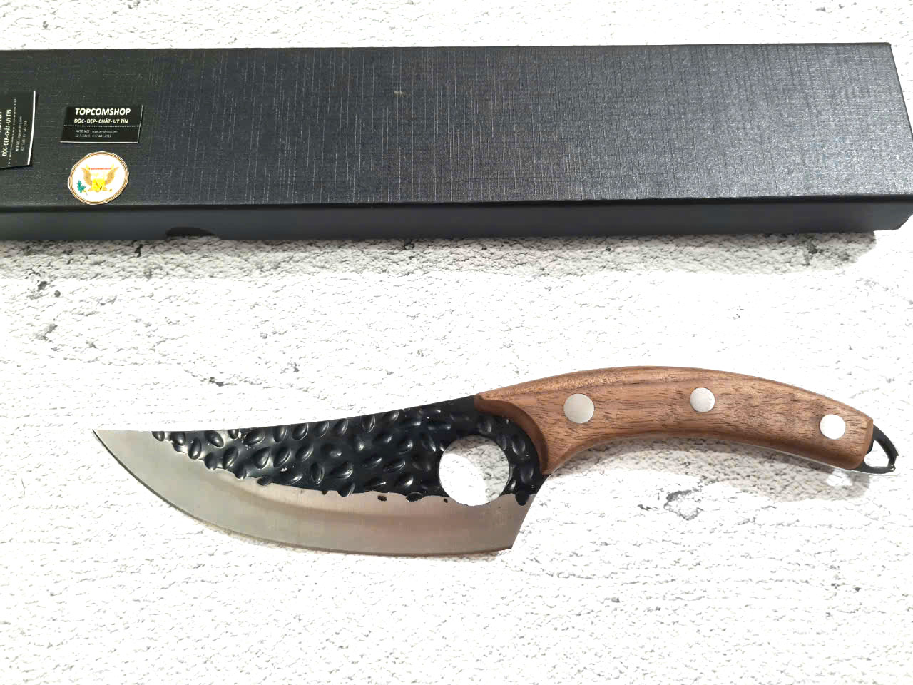 - Chức năng: thái thịt, rau củ quả - Kích thước: Lưỡi: 17cm, cán: 12cm, rộng: 5cm, dầy: 1ly, trọng lượng: 200g - Cán : Gỗ cẩm chỉ, Chốt, Khâu ĐỒNG ĐỎ , keo liên